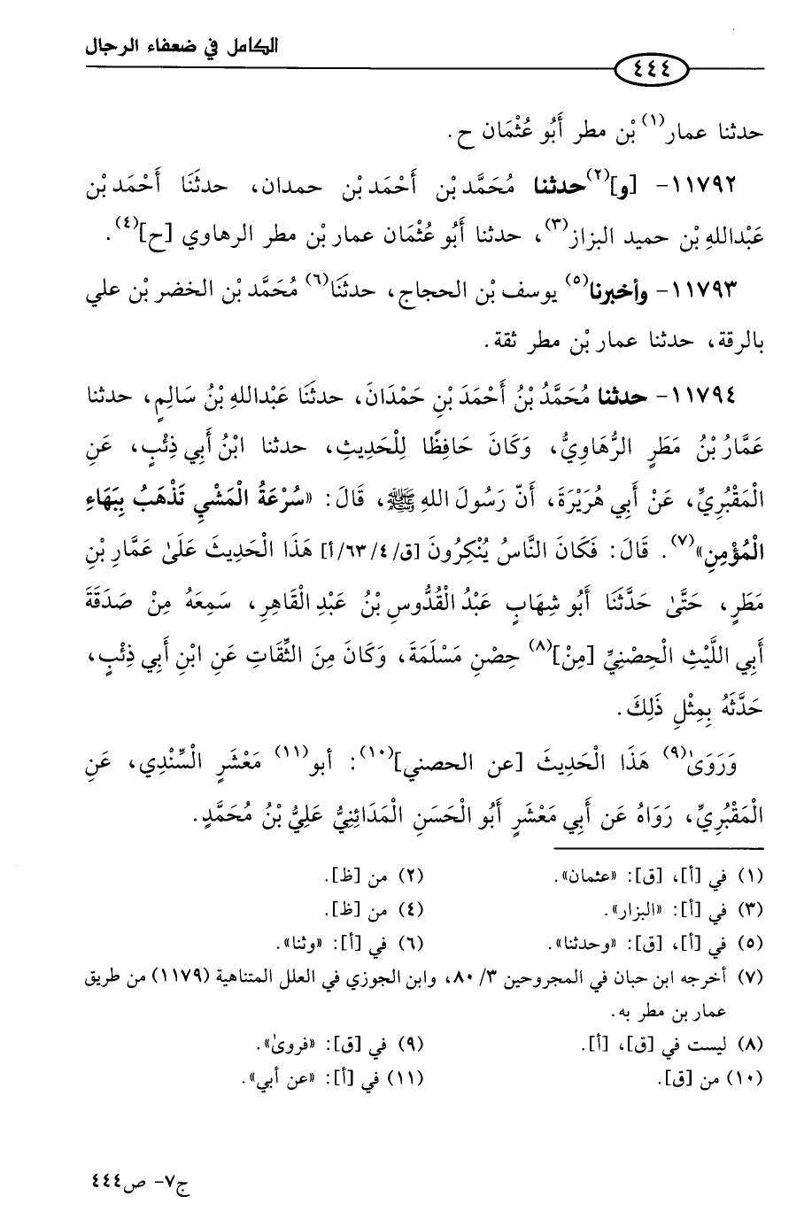 11792 - وحَدثنا مُحمد بن أحمد بن حمدان، حَدثنا أحمد بن عَبد الله بن حميد البزاز، حَدثنا أَبو عثمان عمار بن مطر الرهاوي.