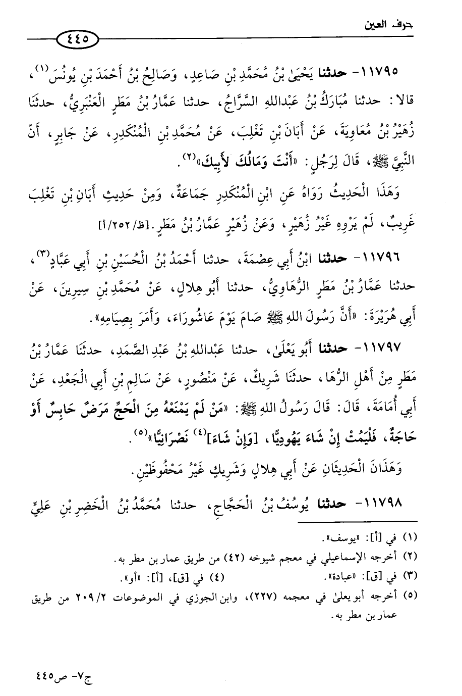 11795 - حَدثنا يَحيى بن مُحمد بن صاعد، وصالح بن أحمد بن يُونُس، قالا: حَدثنا مبارك بن عَبد الله السراج، حَدثنا عمار بن مطر العنبري، حَدثنا زهير بن معاوية، عن أَبَان بن تغلب، عن مُحمد بن المنكدر، عن جابر؛ أن النبي صَلى الله عَليه وسَلم قال لرجل: أنت ومالك لأبيك.
