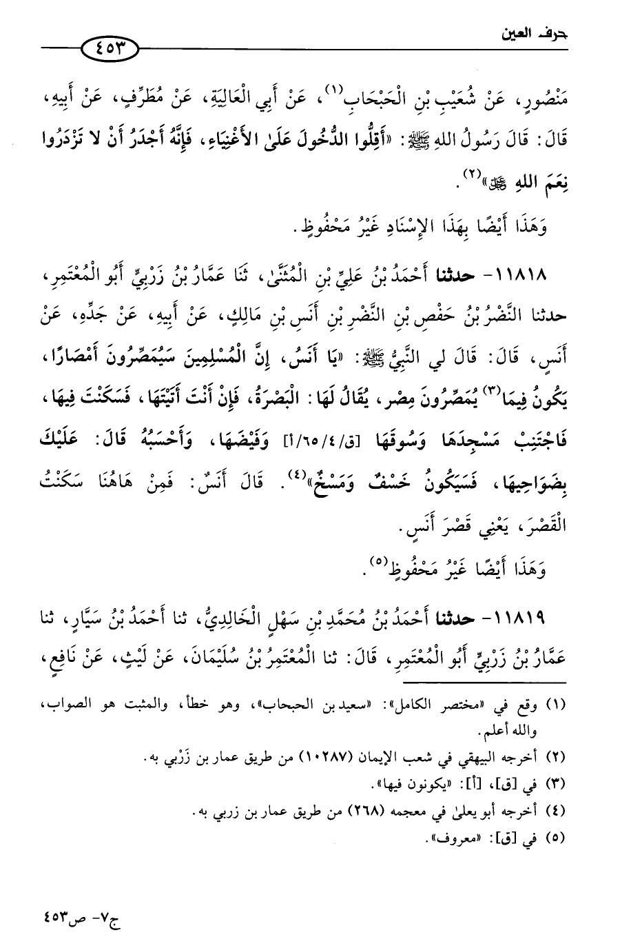 11818 - حَدثنا أحمد بن علي بن المثنى، حَدثنا عمار بن زربي أَبو المعتمر، حَدثنا النضر بن حفص بن النضر بن أنس بن مالك، عن أبيه، عن جَدِّهِ، عن أَنَس، قال: قال لي النبي صَلى الله عَليه وسلم: يا أنس، إن المسلمين سيمصرون أمصارا يكون فيما يمصرون مصر، يقال لها: البصرة، فإن أنت أتيتها فسكنت فيها فاجتنب مسجدها وسوقها وفيضها، وأحسبه قال: عليك بضواحيها، فسيكون خسف ومسخ. قال أنس: فمن هَاهُنا سكنت القصر، يعني قصر أنس.