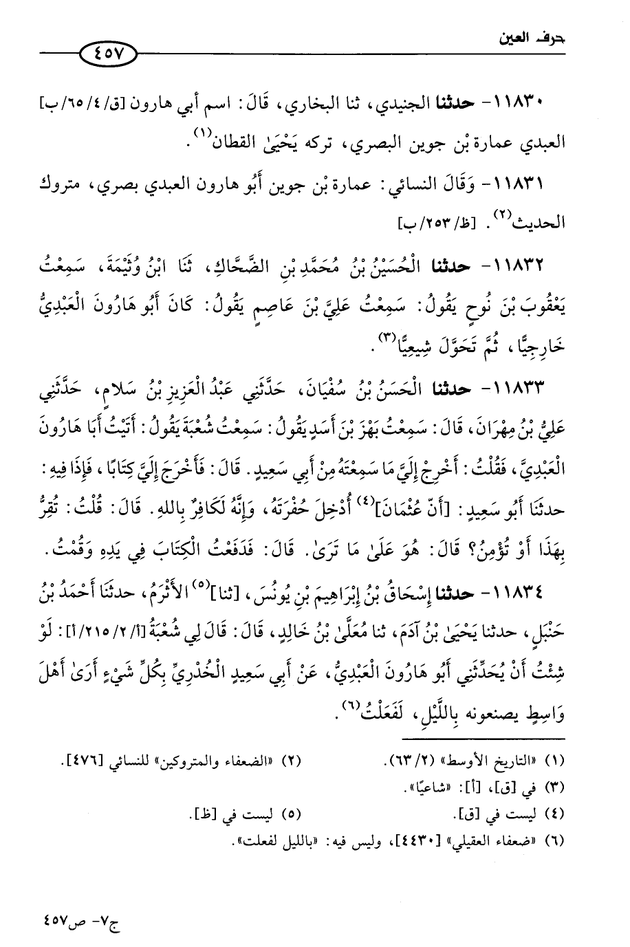 11832 - حَدثنا الحسين بن مُحمد بن الضحاك، حَدثنا ابن وثيمة، سمعت يعقوب بن نوح يقول: سَمعتُ علي بن عاصم يقول: كان أَبو هارون العبدي خارجيا، ثم تحول شيعيا.