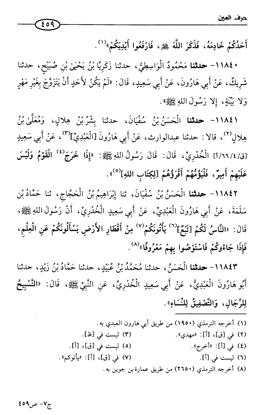 11842 - حَدثنا الحسن بن سفيان، حَدثنا إبراهيم بن الحجاج، حَدثنا حماد بن سلمة، عن أبي هارون العبدي، عن أبي سعيد الخدري؛ أن رسول الله صَلى الله عَليه وسَلم قال: الناس لكم تَبْعٌ، يأتونكم من أقطار الأرض، يسألونكم عن العلم، فإذا جاءوكم فاستوصوا بهم معروفا.