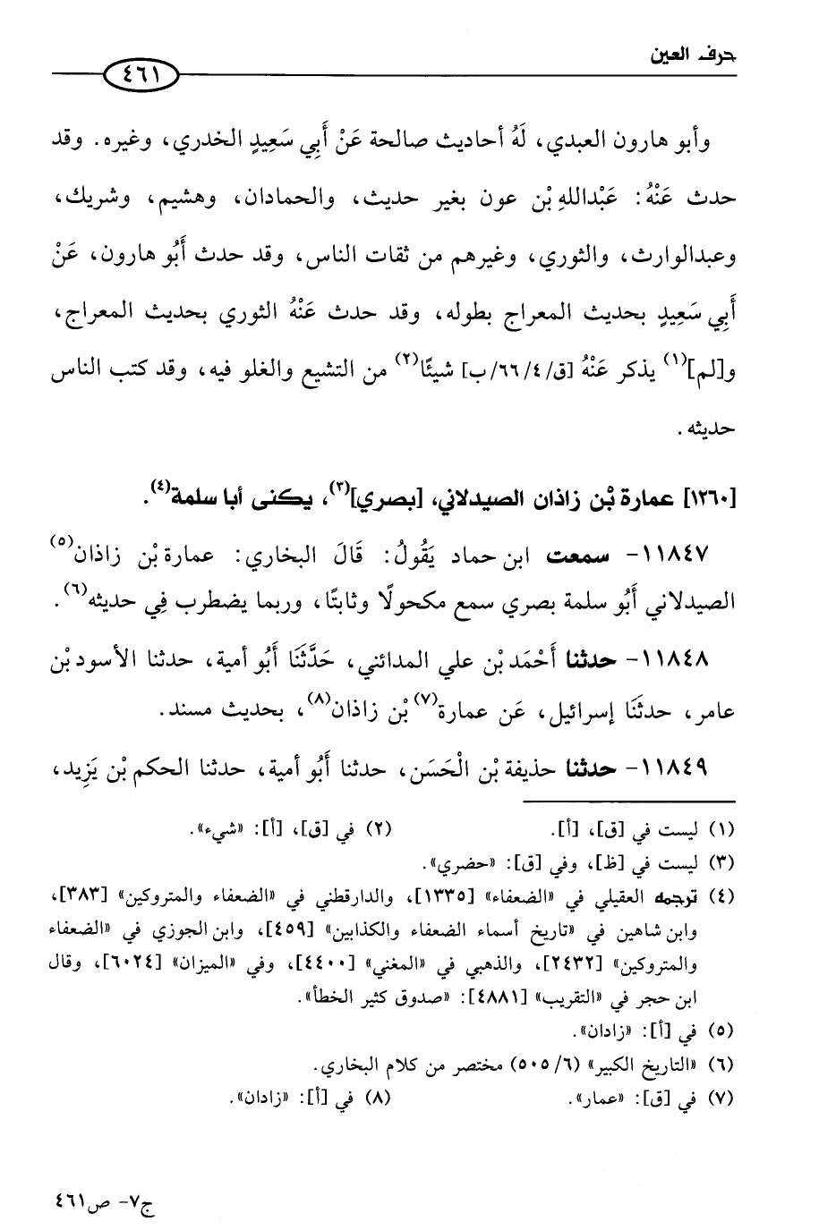 11847 - سمعتُ ابن حماد يقول: قال البُخاري: عمارة بن زاذان الصيدلاني أَبو سلمة بصري، سمع مكحولا وثابتا، ورُبما يضطرب في حديثه.