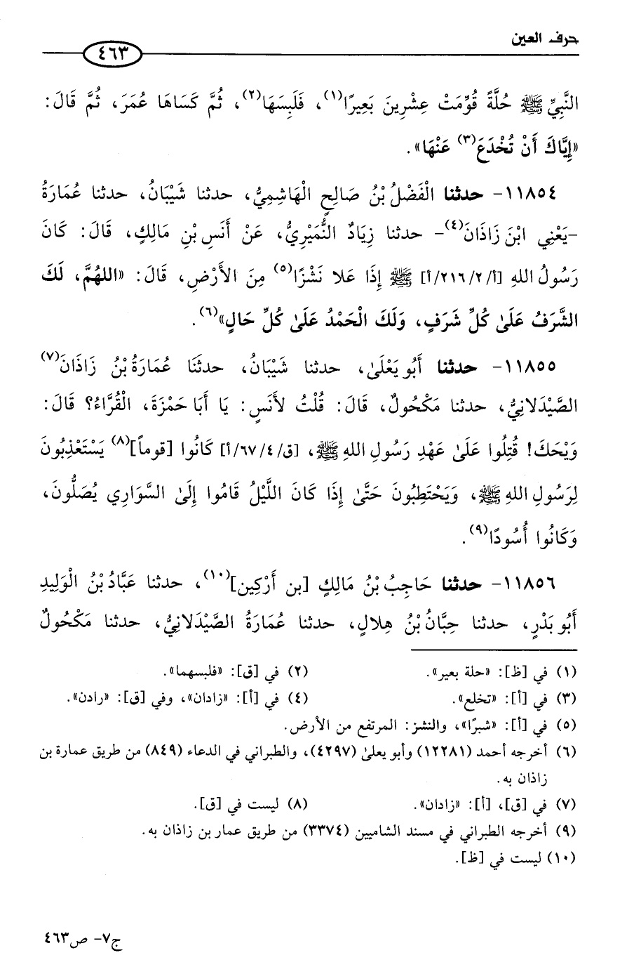 11854 - حَدثنا الفضل بن صالح الهاشمي، حَدثنا شيبان، حَدثنا عمارة، يَعني ابن زاذان، حَدثنا زياد النميري، عن أَنَس بن مالك، قال: كان رسول الله صَلى الله عَليه وسَلم إذا علا نشزاً من الأرض قال: اللهم لك الشرف على كل شرف، ولك الحمد على كل حال.
