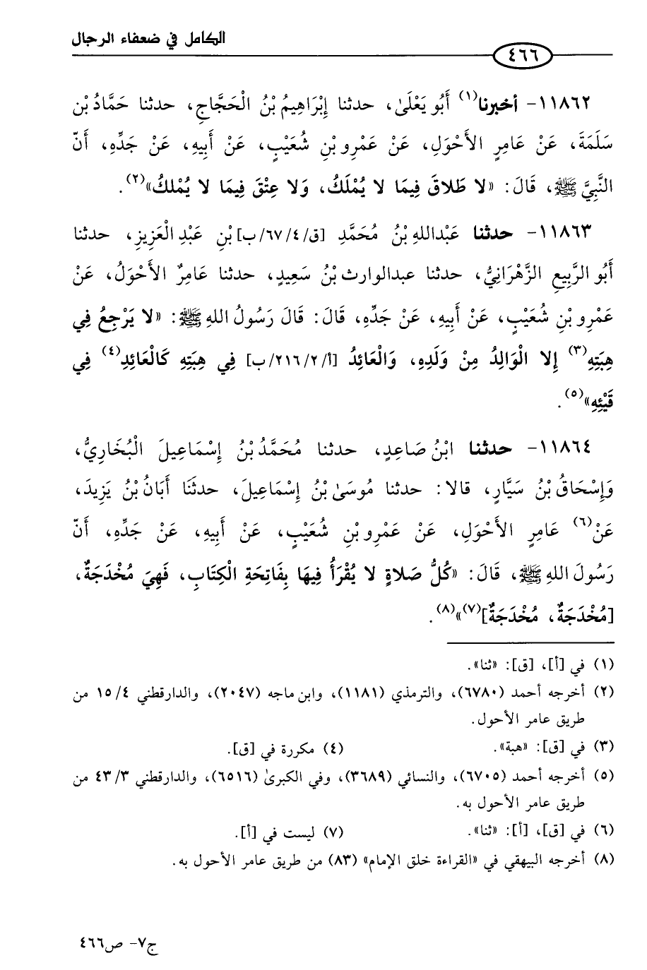 11864 - حَدثنا ابن صاعد، حَدثنا مُحمد بن إسماعيل البُخاري، وإسحاق بن سيار، قالا: حَدثنا موسى بن إسماعيل، حَدثنا أَبَان بن يزيد، عن عامر الأحول، عن عَمرو بن شُعَيب، عن أبيه، عن جَدِّهِ؛ أن رسول الله صَلى الله عَليه وسَلم قال: كل صلاة لا يقرأ فيها بفاتحة الكتاب، فهي مخدجة مخدجة مخدجة.