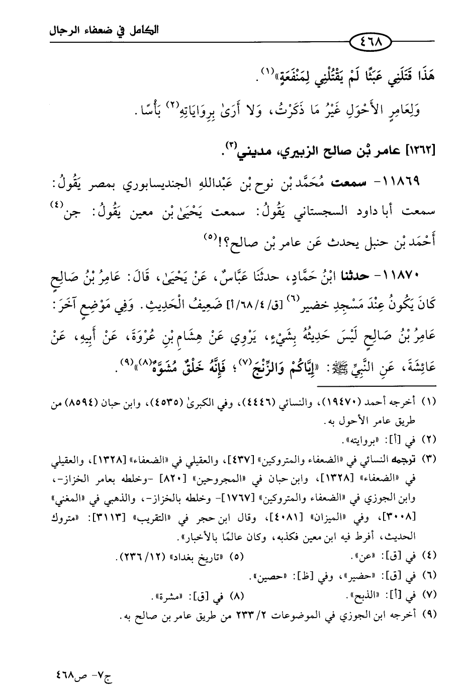 وفي موضعٍ آخر: عامر بن صالح ليس حديثه بشَيءٍ، يروي عن هشام بن عروة، عن أبيه، عن عَائشة، عن النبي صَلى الله عَليه وسلم؛ إياكم والزِّنْجُ، فإنه خَلْقٌ مُشوَّه.