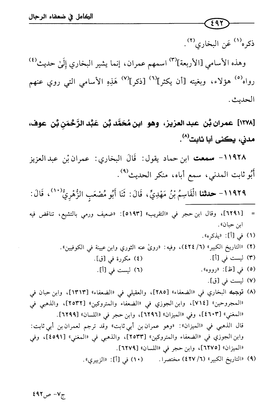 11928 - سمعتُ ابن حماد يقول: قال البُخاري: عمران بن عَبد العزيز أَبو ثابت المدني سمع أباه، منكر الحديث.