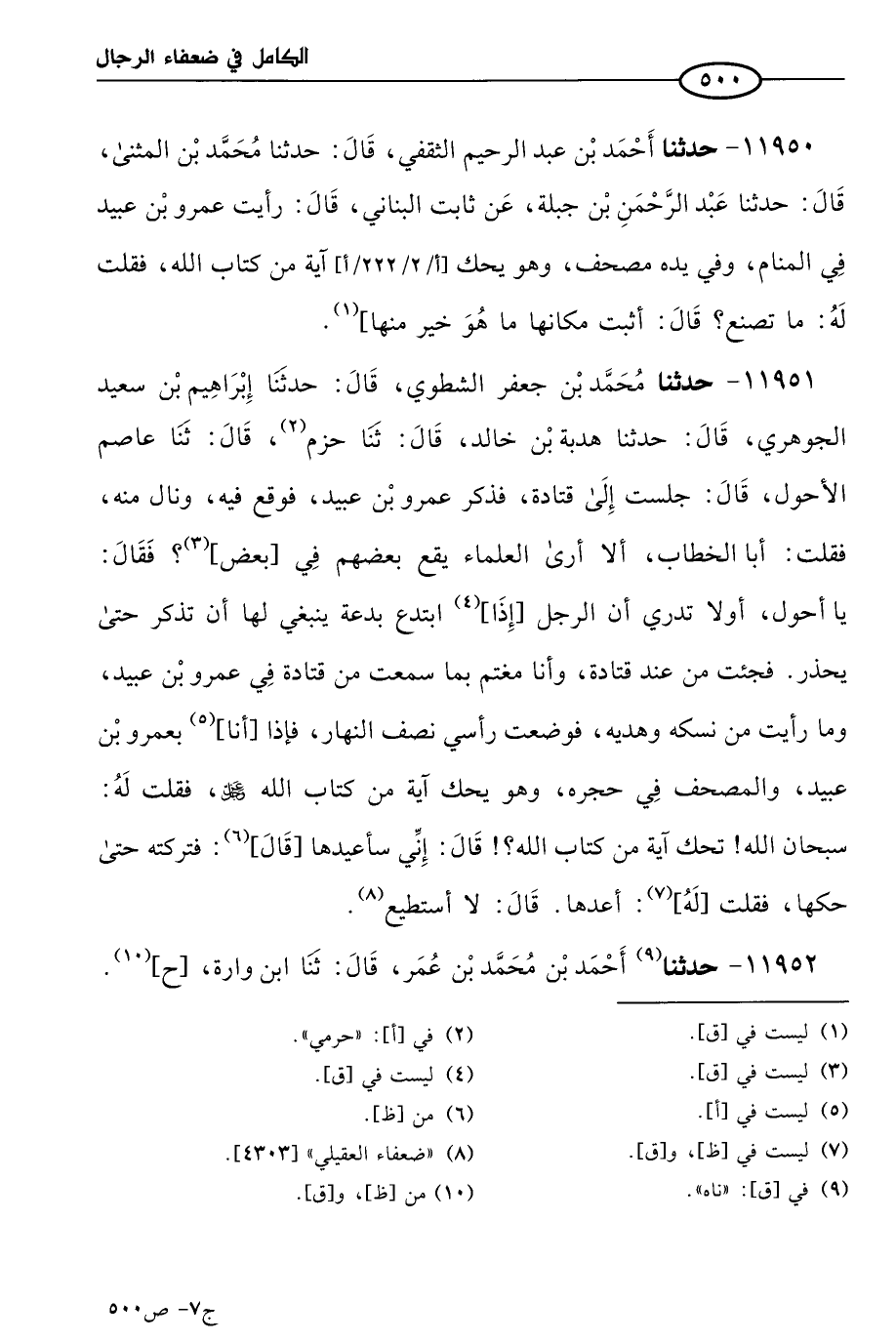 11950 - حَدثنا أحمد بن عَبد الرحيم الثقفي، قال: حَدثنا مُحمد بن المثنى، قال: حَدثنا عَبد الرحمن بن جبلة، عن ثابت البناني، قال: رأيتُ عَمرو بن عُبيد في المنام، وفي يده مصحف، وهو يحك آية من كتاب الله، فقلت له: ما تصنع؟ قال: أثبت مكانها ما هو خير منها.