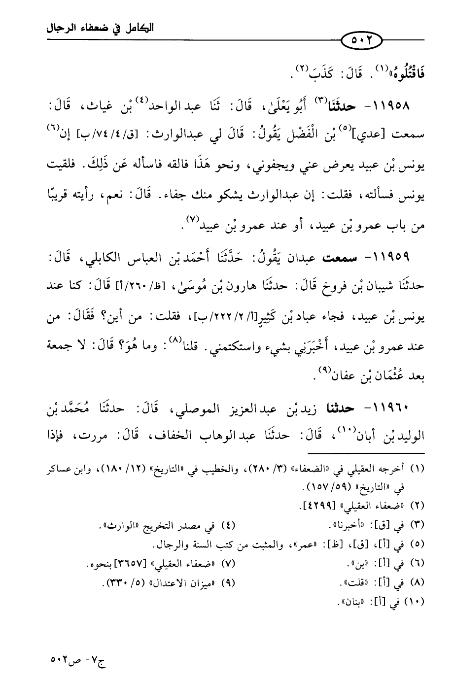 11958 - حَدثنا أَبو يَعلَى، قال: حَدثنا عَبد الواحد بن غياث، قال: سمعتُ عدي بن الفضل، يقول: قال لي عَبد الوارث: إن يُونُس بن عُبيد يعرض عني ويجفوني ونحو هذا، فالقه فاسأله عن ذلك، فلقيت يُونُس فسألته، فقلت: إن عَبد الوارث يشكو منك جفاء؟ قال: نَعم، رأيته قريبًا من باب عَمرو بن عُبيد، أو عند عَمرو بن عُبيد.