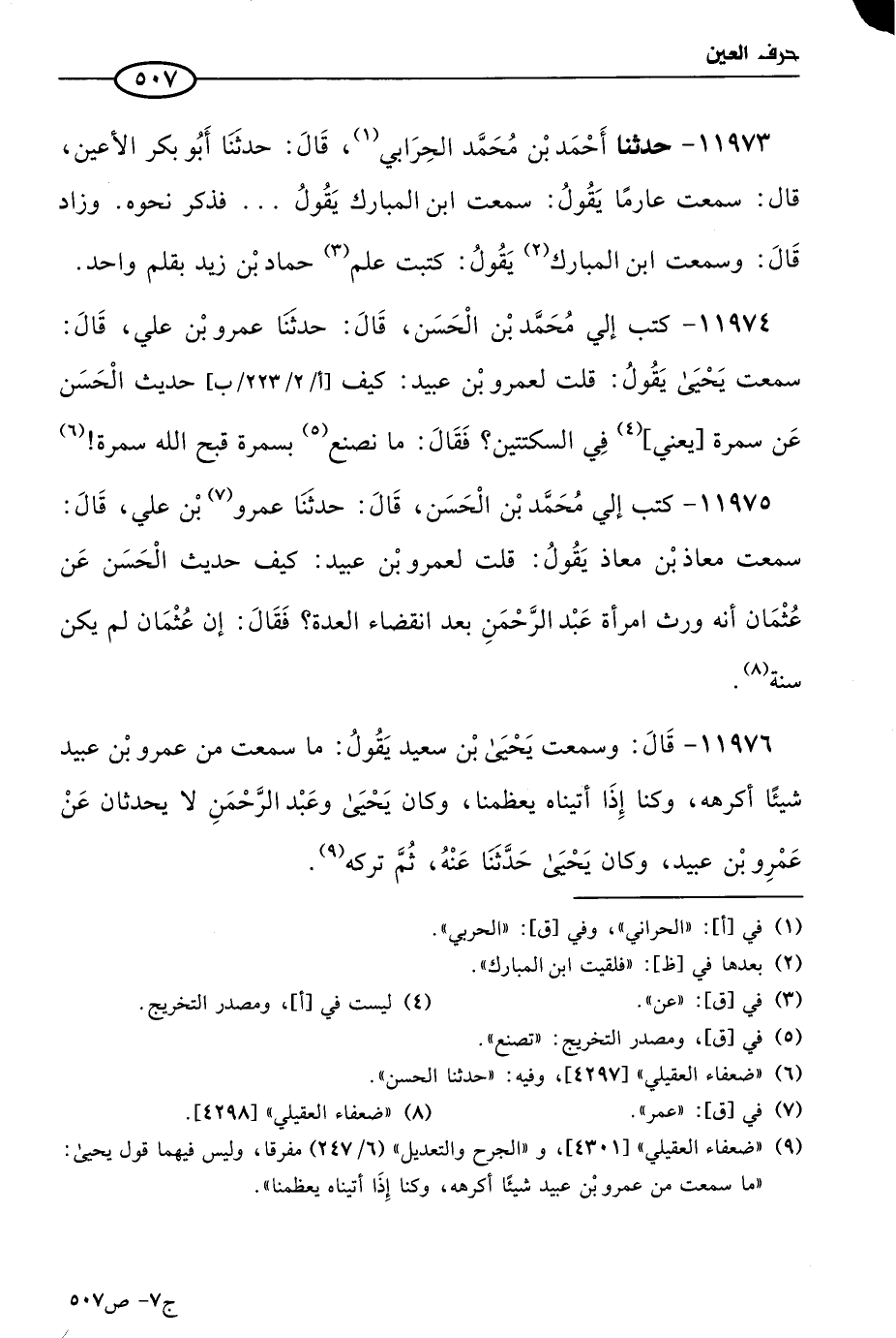 11973 - حَدثنا أحمد بن مُحمد الحرابي، قال: حَدثنا أَبو بكر الأعين، سمعت عارما يقول: سَمعتُ ابن المبارك يقول: فذكر نحوه، وزاد: قال: وسمعتُ ابن المُبَارك يقول: كتبت علم حماد بن زيد بقلم واحد.