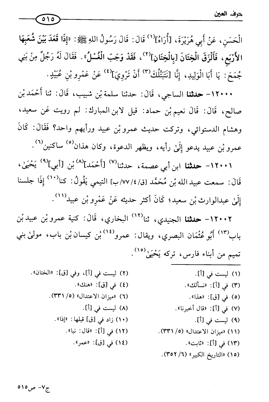 12000 - حَدثنا الساجي، قال، حَدثنا سلمة بن شبيب، قال: حَدثنا أحمد بن صالح، قال: قال نعيم بن حماد: قيل لابن المبارك: لم رويت عن سعيد وهِشام الدستوائي، وتركت حديث عَمرو بن عُبيد، ورأيهم واحد، فقال: كان عَمرو بن عُبيد يدعو إلى رأيه ويظهر الدعوة، وكان هذان ساكنين.