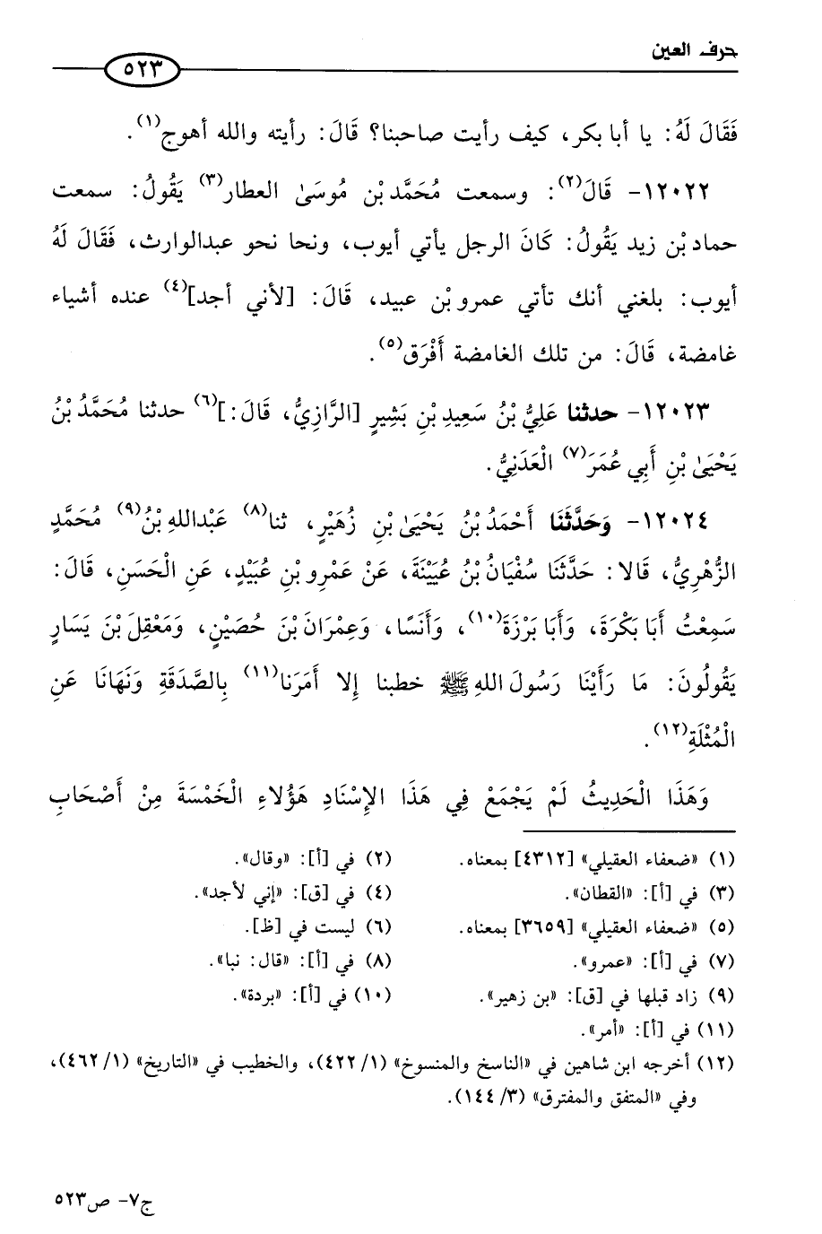 12023 - حَدثنا علي بن سعيد بن بشير الرازي، قال: حَدثنا مُحمد بن يَحيى بن أبي عُمر العدني (ح)