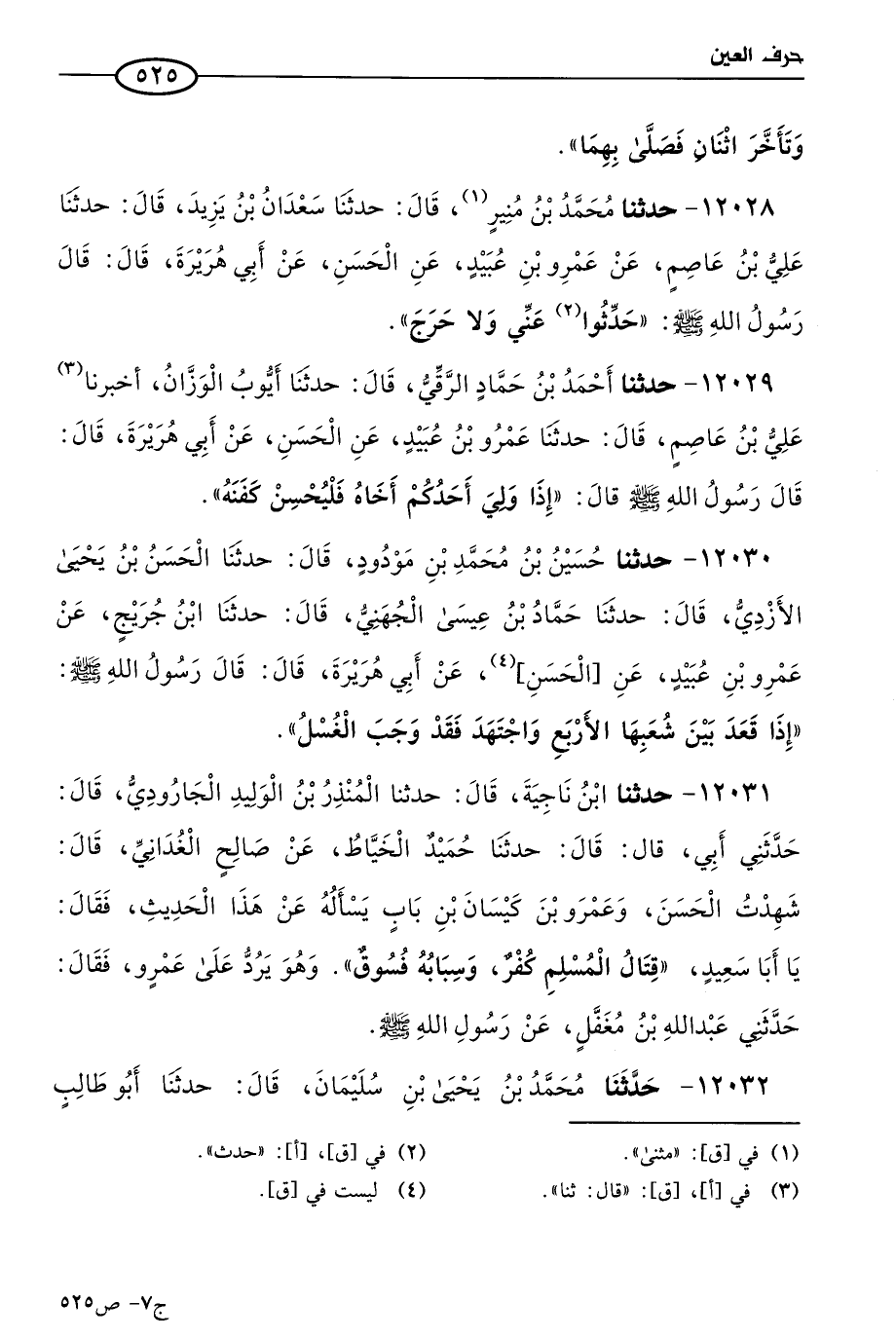 12028 - حَدثنا مُحمد بن منير، قال: حَدثنا سعدان بن يزيد، قال: حَدثنا علي بن عاصم، عن عَمرو بن عُبيد، عن الحسن، عن أبي هريرة، قال: قال رسول الله صَلى الله عَليه وسَلم: حدثوا عني ولا حرج.
