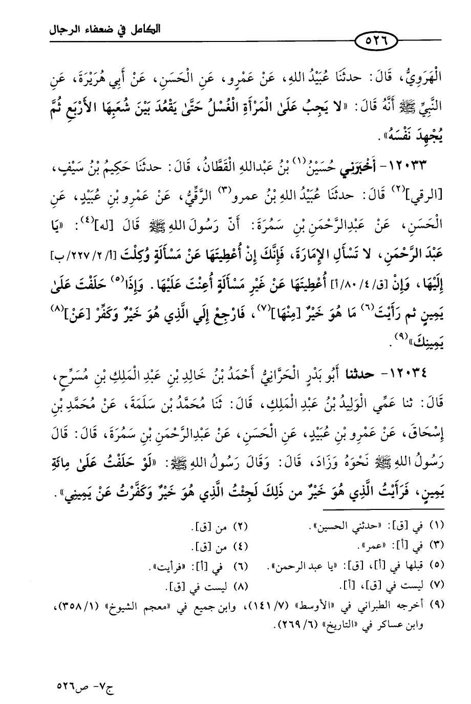 12033 - أخبرني حسين بن عبد الله القطان، قال: حَدثنا حكيم بن سيف الرقي، قال: حَدثنا عُبيد الله بن عمرو الرقي، عن عَمرو بن عُبيد، عن الحسن، عن عَبد الرحمن بن سمرة؛ أن رسول الله صَلى الله عَليه وسَلم قال له: يا عَبد الرحمن، لا تسأل الإمارة، فإنك إن أعطيتها عن مسألة وكلت إليها، وإن أعطيتها عن غير مسألة أعنت عليها، وإذا حلفت على يمين، ثم رأيت ما هو خير منها فارجع إلي الذي هو خير، وكفر عن يمينك.