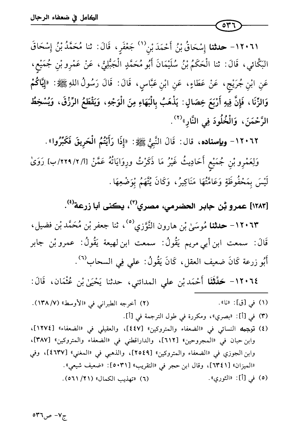 12063 - حَدثنا موسى بن هارون التوزي، حَدثنا جعفر بن مُحمد بن فضيل، قال: سمعتُ ابن أبي مريم، يقول: سَمعتُ ابن لَهِيعَة يقول: عَمرو بن جابر أبُو زُرْعَة كان ضعيف العقل، كان يقول: علي في السحاب.