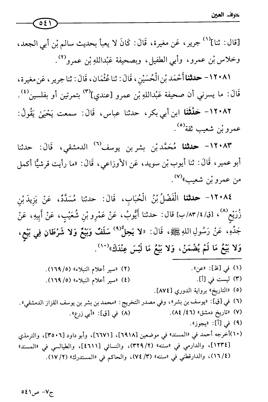 12083 - حَدثنا مُحمد بن بشر بن يوسف القزاز الدمشقي، قال: حَدثنا أبو عُمَير، قال: حَدثنا أيوب بن سويد، عن الأَوزاعي قال: مَا رأيتُ قرشيا أكمل من عَمرو بن شُعَيب.