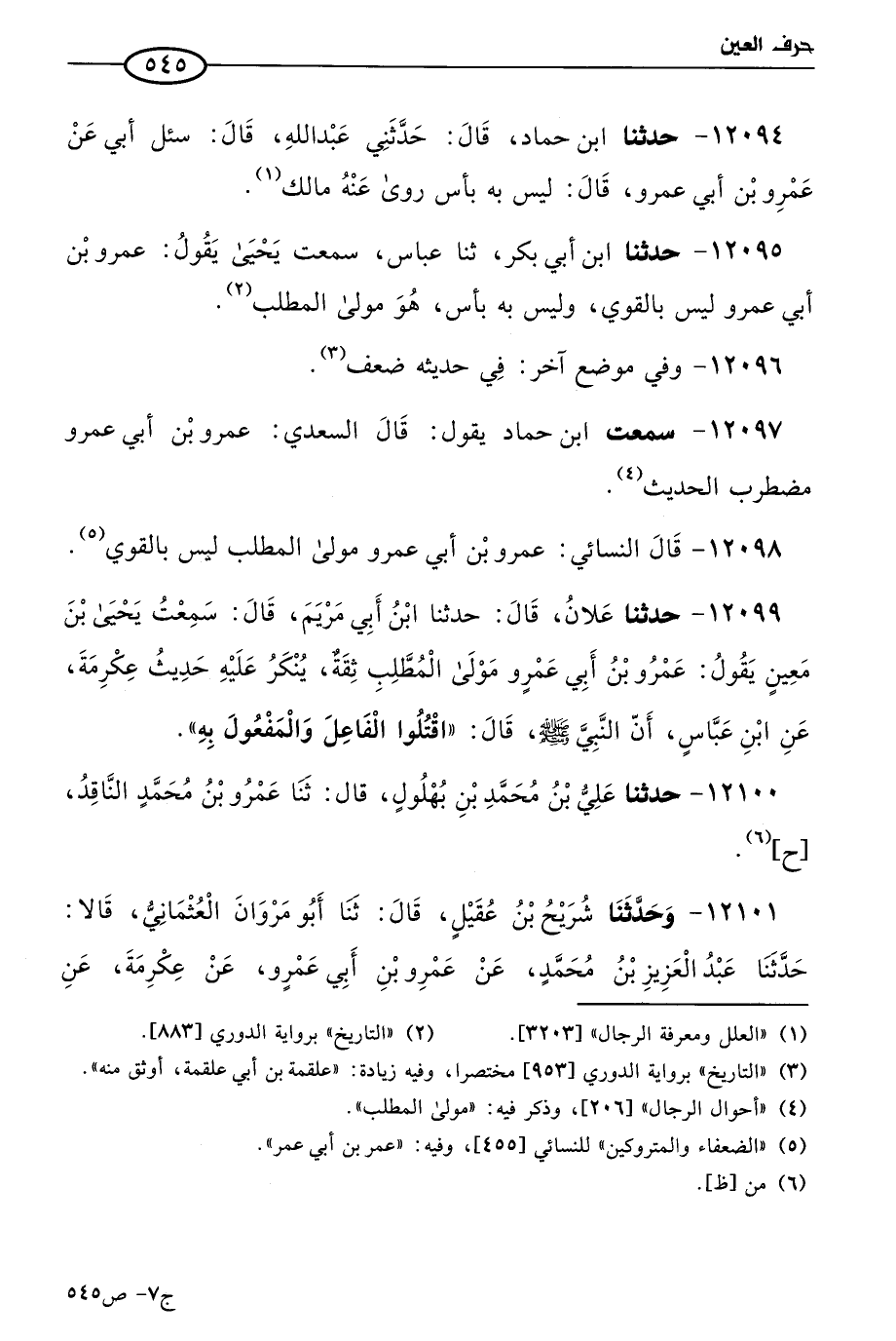 12099 - حَدثنا علان، قال: حَدثنا ابن أبي مريم، قال: سمعتُ يَحيى بن مَعين، يقول: عَمرو بن أبي عَمرو مولى المطلب ثقة، ينكر عليه حديث عِكرمَة، عن ابن عباس، أن النبي صَلى الله عَليه وسَلم قال: اقتلوا الفاعل، والمفعول به.