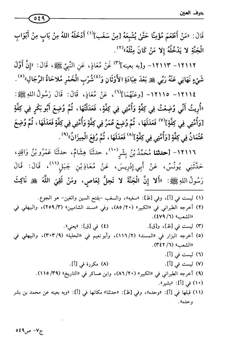 12114 - 12115 - وعنهما، عن معاذ، قال: قال رسول الله صَلى الله عَليه وسَلم: أُريت أني وُضعت في كفة وأمتي في كفة، فعدلتها، ثم وضع أَبو بكر في كفة وأمتي في كفة، فعدلها، ثم وضع عُمر في كفة وأمتي في كفة، فعدلها، ثم وضع عثمان في كفة وأمتي في كفة، فعدلها، ثم رفع الميزان.