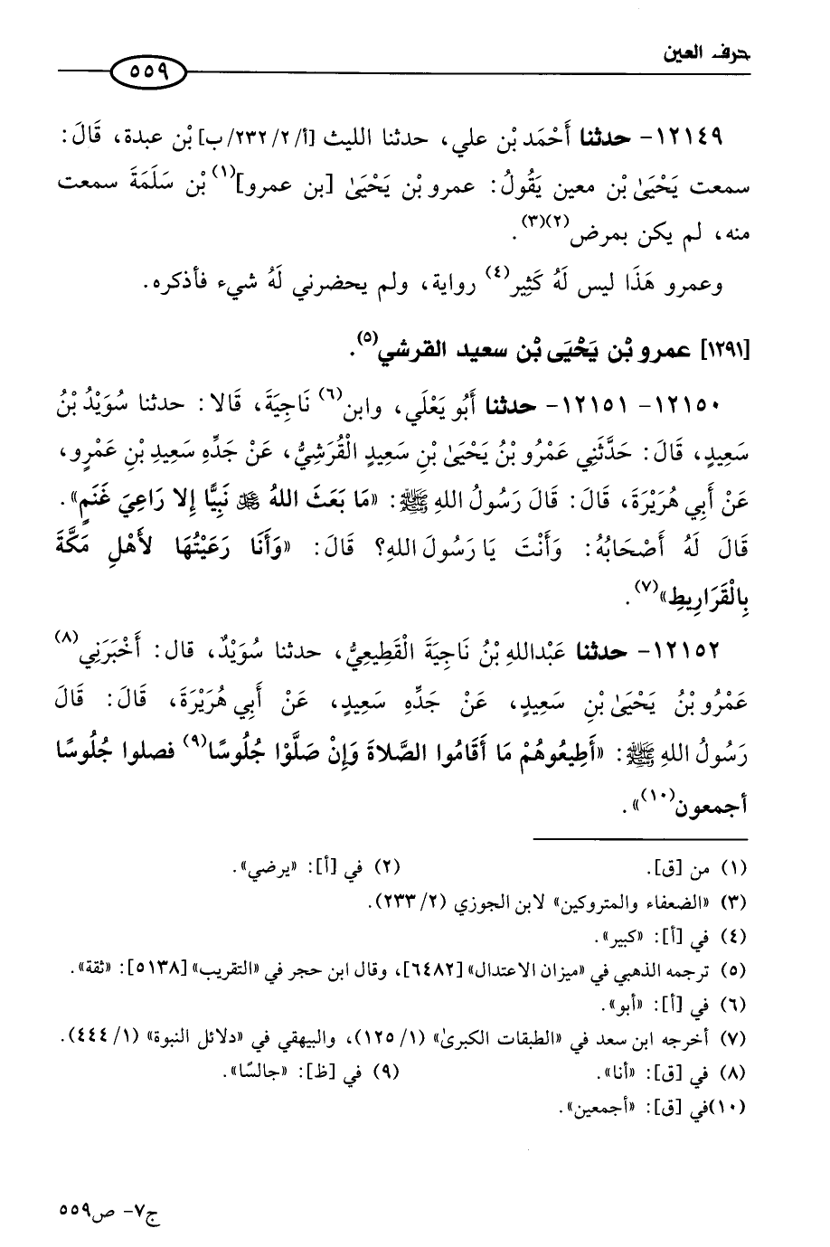 12149 - حَدثنا أحمد بن علي، حَدثنا الليث بن عبدة، قال: سمعتُ يَحيى بن مَعين، يقول: عَمرو بن يَحيى بن عمرو بن سلمة سمعت منه، لم يكن بمرض.