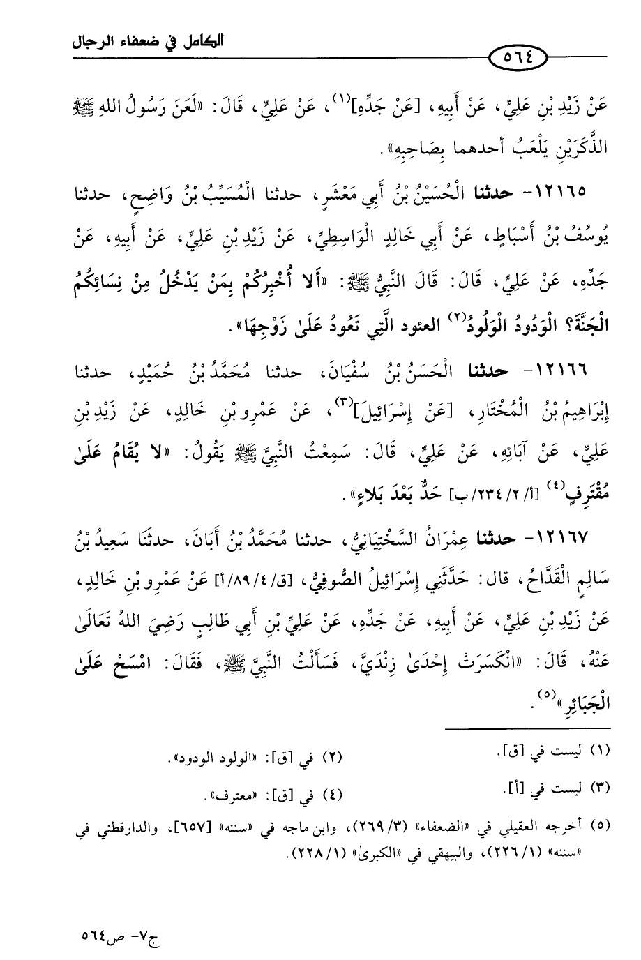 12165 - حَدثنا الحسين بن أبي معشر، قال: حَدثنا المُسَيَّب بن واضح، حَدثنا يوسف بن أسباط، عن أبي خالد الواسطي، عن زيد بن علي، عن أبيه، عن جَدِّهِ، عن علي، قال: قال النبي صَلى الله عَليه وسلم: ألا أخبركم بمن يدخل من نسائكم الجنة، الودود الولود، العئود التي تعود على زوجها.