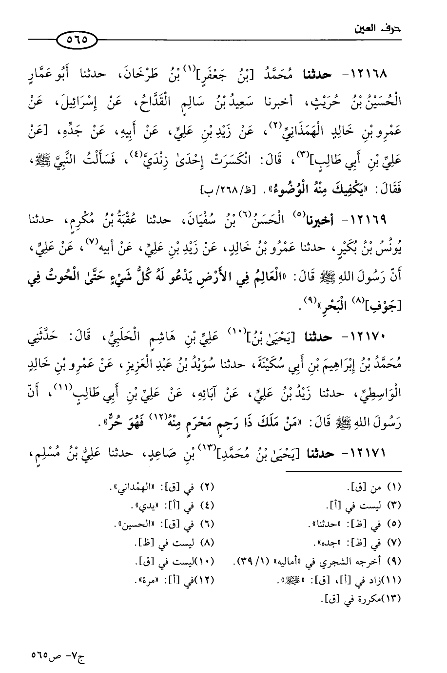 12169 - حَدثنا الحسن بن سفيان، حَدثنا عقبة بن مكرم، حَدثنا يُونُس بن بُكَير، حَدثنا عَمرو بن خالد، عن زيد بن علي، عن أبيه، عن علي أن رسول الله صَلَّى الله عَلَيه قال: العالم في الأرض يدعو له كل شيء حتى الحوت في جوف البحر.