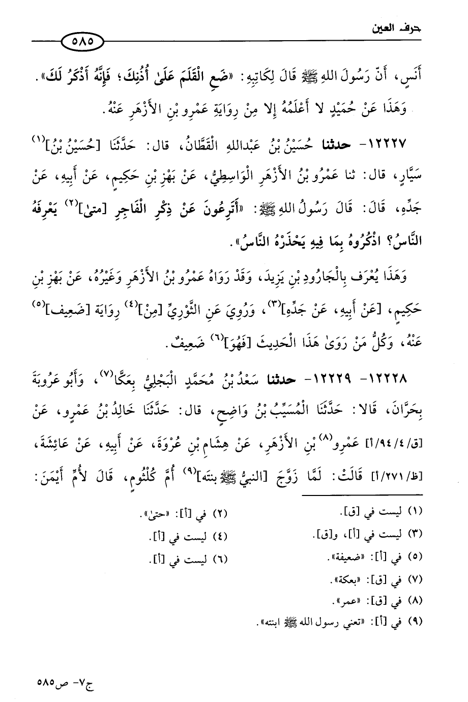 12227 - حَدثنا حسين بن عَبد الله القطان، قال: حَدثنا حسين بن سيار، قال: حَدثنا عَمرو بن الأزهر الواسطي، عن بهز بن حكيم، عن أبيه، عن جَدِّهِ، قال: قال رسول الله صَلى الله عَليه وسَلم: أترعون عن ذكر الفاجر حتى يعرفه الناس، اذكروه بما فيه يحذره الناس.