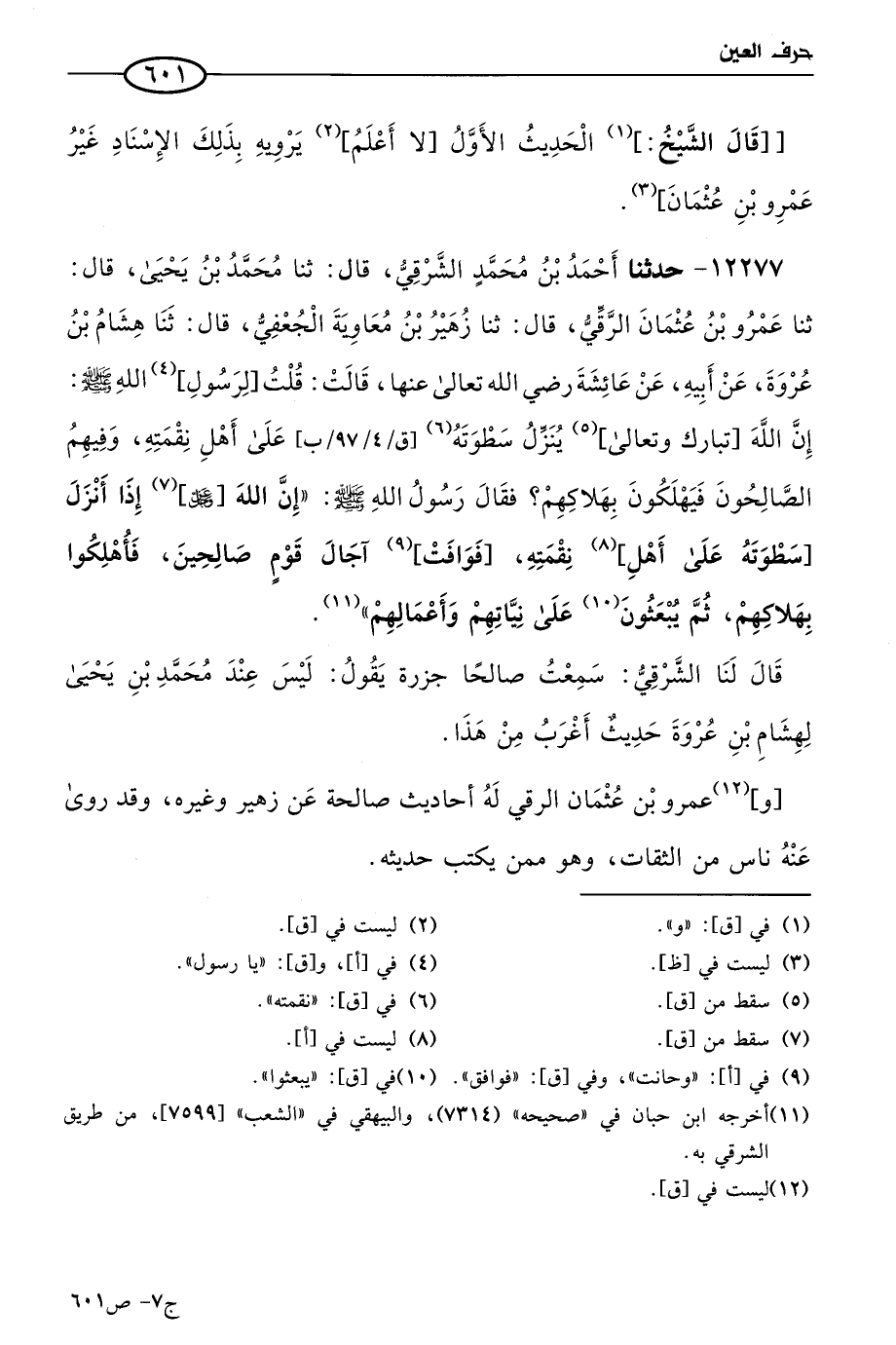 12277 - حدثنا أحمد بن مُحمد الشرقي، قال: حَدثنا مُحمد بن يَحيى، قال: حَدثنا عَمرو بن عثمان الرقي، قال: حَدثنا زهير بن معاوية الجعفي، قال: حَدثنا هشام بن عروة، عن أبيه، عن عائشة رضي الله تعالى عنها قالت: قلت لرسول الله صَلَّى الله عَلَيه وسلَّم ََ: إن الله تبارك وتعالى ينزل سطوته على أهل نقمته، وفيهم الصالحون فيهلكون بهلاكهم، فقال رسول الله صَلى الله عَليه وسَلم: إن الله عَزّ وجَلّ إذا أنزل سطوته على أهل نقمته، فوافت آجال قوم صالحين، فأهلكوا بهلاكهم، ثم يبعثون على نياتهم وأعمالهم.