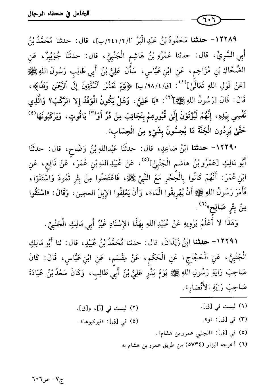12291 - حَدثنا ابن زيدان، قال: حَدثنا مُحمد بن عُبيد، قال: حَدثنا أَبو مالك الجنبي، عن الحجاج، عن الحكم، عن مقسم، عن ابن عباس، قال: كان صاحب راية رسول الله صَلى الله عَليه وسَلم يوم بدر، علي بن أبي طالب عليه السلام.