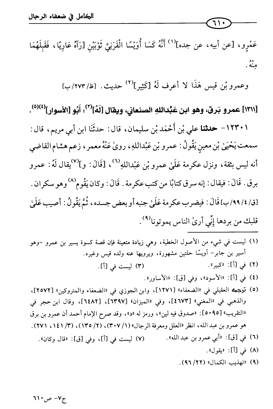 12301 - حَدثنا علي بن أحمد بن سليمان، قال: حَدثنا ابن أبي مريم، قال: سَمعتُ يَحيَى بن مَعين يَقول: عَمرو بن عبد الله روى عنه مَعمَر, زعم هِشَام القاضي أنه ليس بثقةٍ, ونزل عِكْرِمَة على عَمرو بن عبد الله, قال: ويُقال له: عَمرو بَرْق, قال: فيقال: إنه سَرَق كتابًا من كُتب عِكْرِمَة, قال: وكان يقوم وهو سكران, قال: فيضرب عِكْرِمَة على جنبه, أو بعض جسده, ثم يَقول: