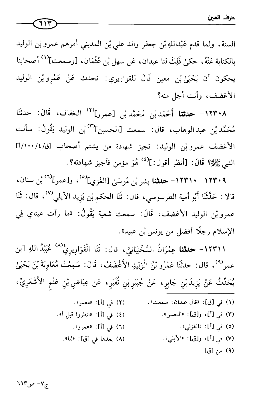 12308 - حَدثنا أحمد بن مُحمد بن عَمرو الخفاف، قال: حَدثنا مُحمد بن عَبد الوهاب، قال: سمعتُ الحسين بن الوليد يقولُ: سَألتُ الأغضف عَمرو بن الوليد: تُجيز شهادة من يشتم أصحاب النبي صَلى الله عَليه وسلم؟ قال: انظر قبل، أهو مؤمن، فأجيز شهادته (1).