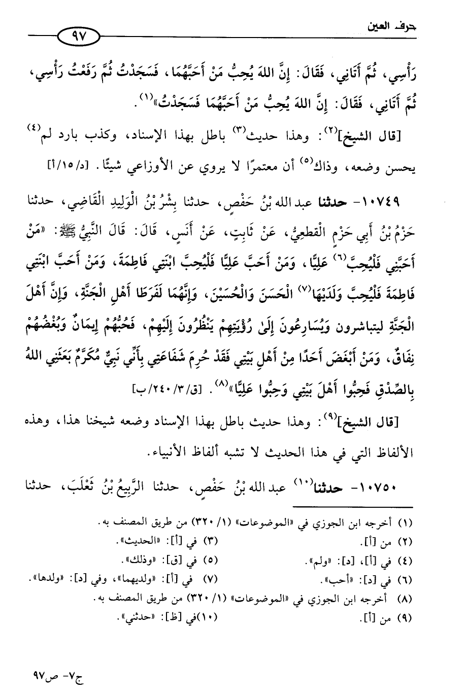 10749 - حَدثنا عَبد الله بن حفص، حَدثنا بشر بن الوليد القاضي، حَدثنا حزم بن أبي حزم القطعي، عن ثابت، عن أَنَس، قال: قال النبي صَلي الله عَليه وسلم: من أحبني فليحب عَليًا، ومن أحب عَليًا فليحب ابنتي فاطمة، ومن أحب ابنتي فاطمة فليحب ولديها الحسن والحُسَين، وإنهما لفرطا أهل الجنة، وإن أهل الجنة ليتباشرون ويسارعون إلي رؤيتهم، ينظرون إليهم، فحبهم إيمان، وبغضهم نفاق، ومن أبغض أحدًا من أهل بيتي، فقد حرم شفاعتي، بأني نبي مكرم بعثني الله بالصدق، فحبوا أهل بيتي، وحبوا عليا.
