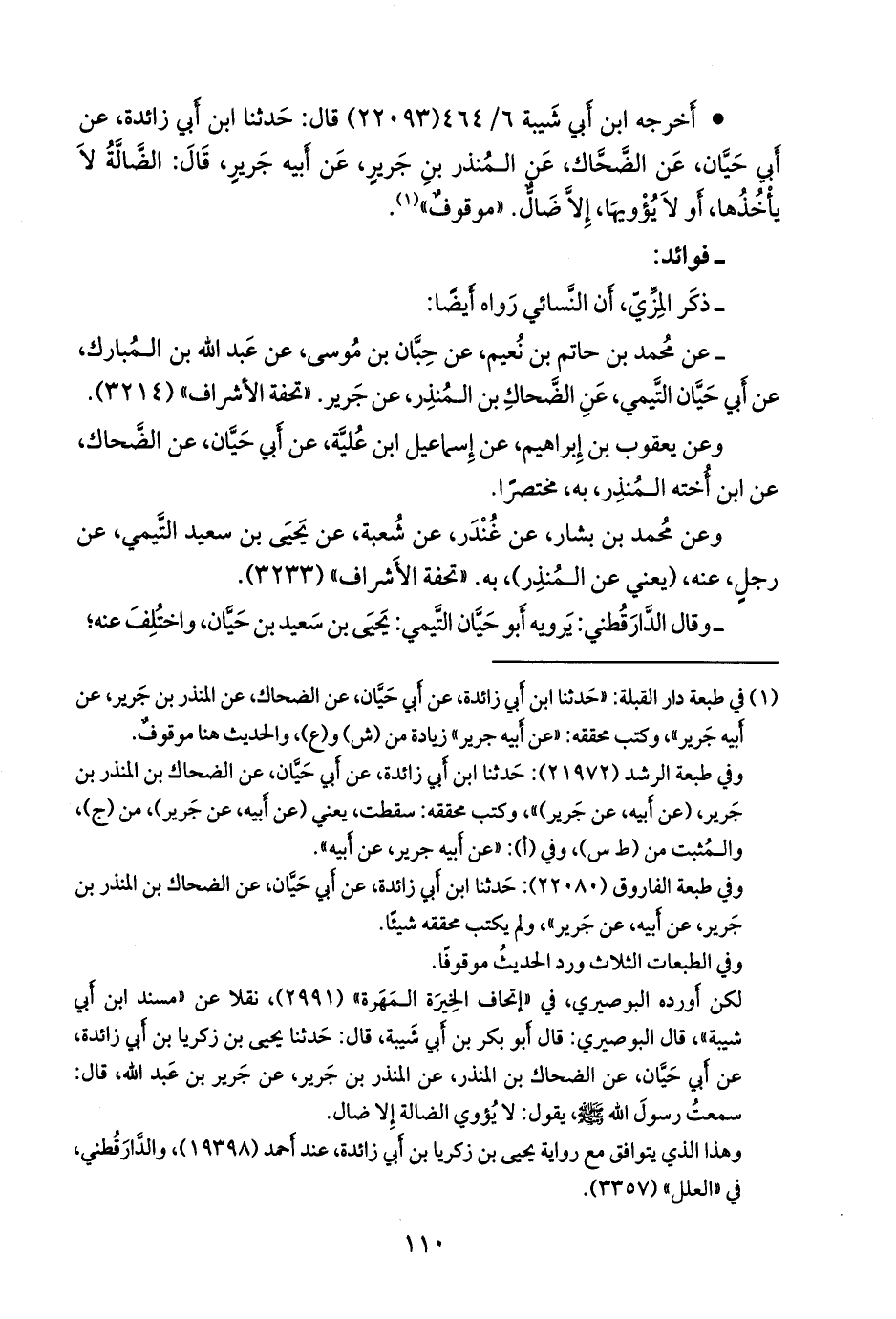 - قال ابن عبد الهادي: قال علي بن المديني، عن حديث جَرير؛ أَن النبي صَلى الله عَليه وسَلم قال: لا يأوي الضالة إِلا ضال: رواه أَبو حَيَّان، عن الضحاك خال المنذر بن جَرير، عن المنذر بن جَرير، عن أَبيه، والضحاك لا يعرفونه، روى عنه أَبو حَيَّان، ولم يَرو عنه غيره. «تنقيح التحقيق» ٤/ ٢٣٥.