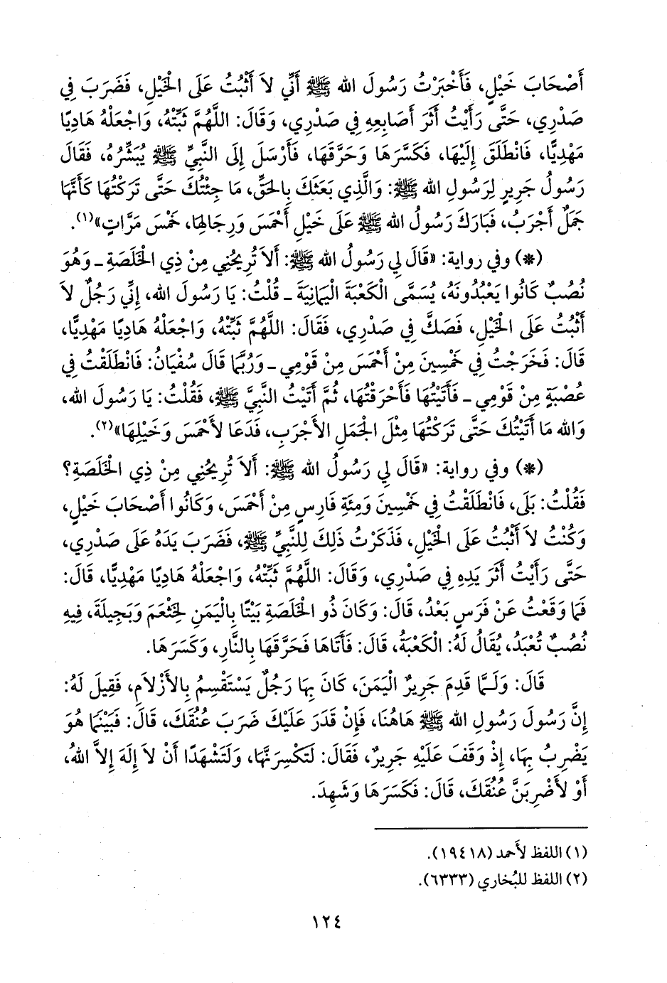 - وفي رواية: «قال لي رسول الله صَلى الله عَليه وسَلم: ألا تريحني من ذي الخلصة؟ فقلت: بلى، فانطلقت في خمسين ومئة فارس من أحمس، وكانوا أصحاب خيل، وكنت لا أثبت على الخيل، فذكرت ذلك للنبي صَلى الله عَليه وسَلم فضرب يده على صدري، حتى رأيت أثر يده في صدري، وقال: اللهم ثبته، واجعله هاديا مهديا، قال: فما وقعت عن فرس بعد، قال: وكان ذو الخلصة بيتا باليمن لخثعم وبجيلة، فيه نصب تعبد، يقال له: الكعبة، قال: فأتاها فحرقها بالنار، وكسرها.