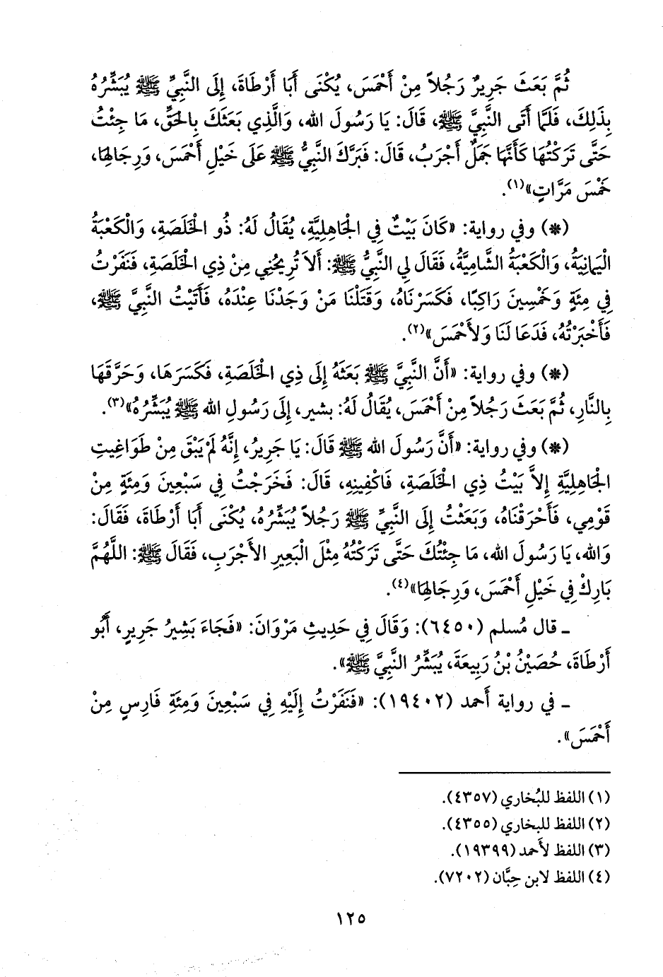 - وفي رواية: «أن النبي صَلى الله عَليه وسَلم بعثه إلى ذي الخلصة، فكسرها، وحرقها بالنار، ثم بعث رجلا من أحمس، يقال له: بشير، إلى رسول الله صَلى الله عَليه وسَلم يبشره» (¬١).