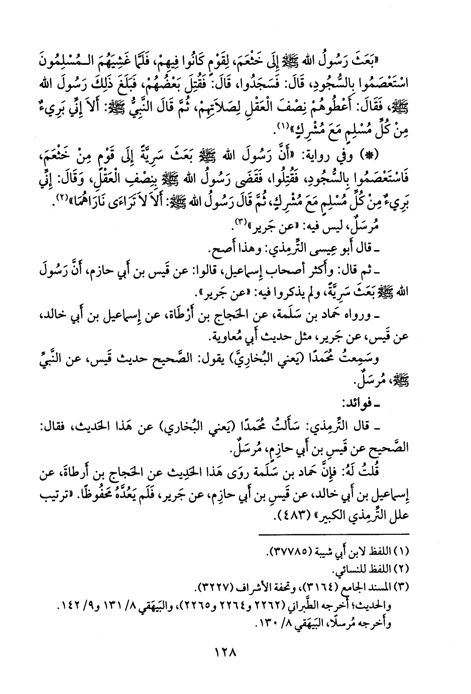 - وفي رواية: «أن رسول الله صَلى الله عَليه وسَلم بعث سرية إلى قوم من خثعم، فاستعصموا بالسجود، فقتلوا، فقضى رسول الله صَلى الله عَليه وسَلم بنصف العقل، وقال: إني بريء من كل مسلم مع مشرك، ثم قال رسول الله صَلى الله عَليه وسَلم: ألا لا تراءى ناراهما» (¬١).