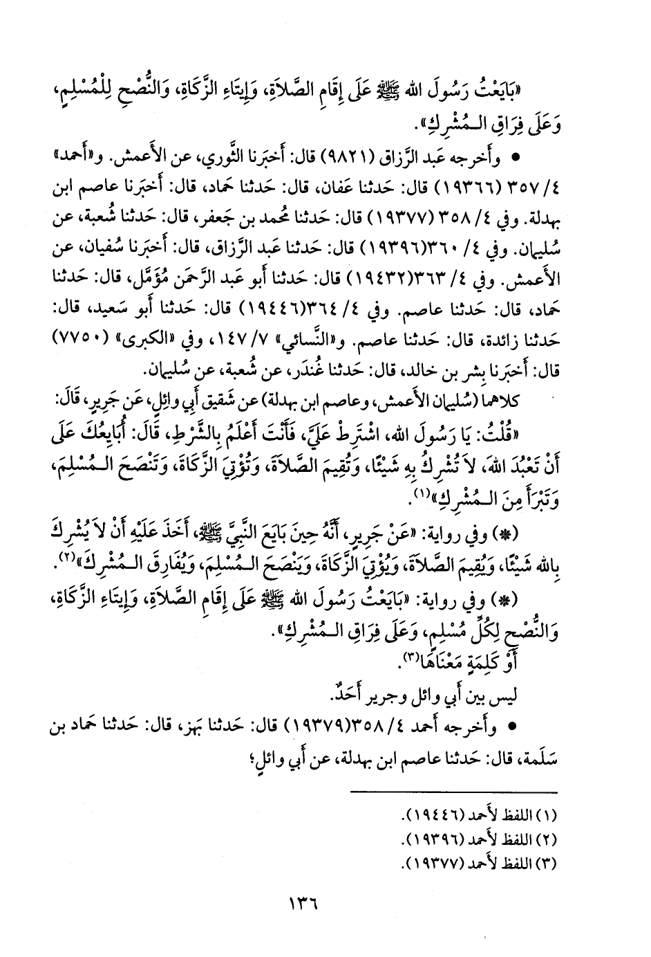 - وفي رواية: «عن جرير، أنه حين بايع النبي صَلى الله عَليه وسَلم أخذ عليه أن لا يشرك بالله شيئا، ويقيم الصلاة، ويؤتي الزكاة، وينصح المسلم، ويفارق المشرك» (¬٢).