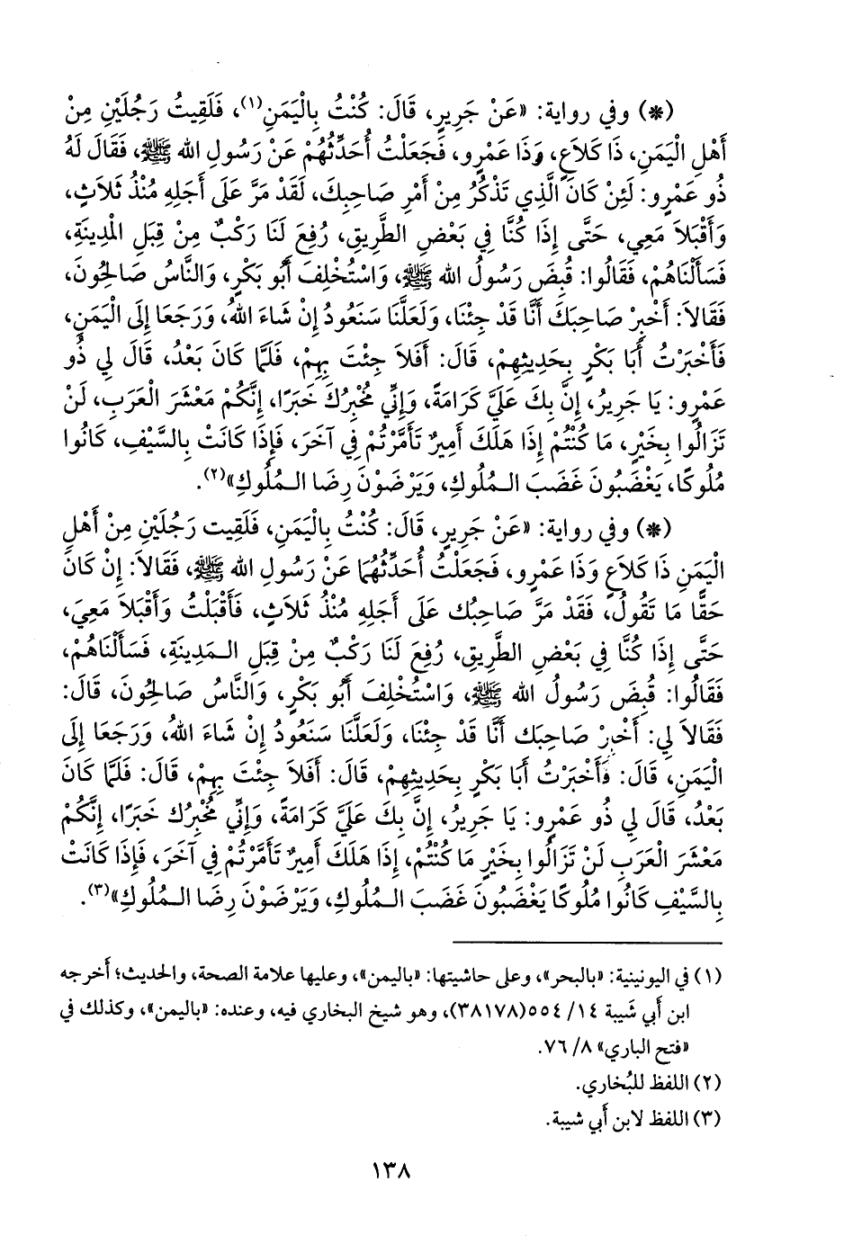 - وفي رواية: «عن جرير، قال: كنت باليمن، فلقيت رجلين من أهل اليمن ذا كلاع وذا عَمرو، فجعلت أحدثهما عن رسول الله صَلى الله عَليه وسَلم فقالا: إن كان حقا ما تقول، فقد مر صاحبك على أجله منذ ثلاث، فأقبلت وأقبلا معي، حتى إذا كنا في بعض الطريق، رفع لنا ركب من قبل المدينة، فسألناهم، فقالوا: قبض رسول الله صَلى الله عَليه وسَلم واستخلف أَبو بكر، والناس صالحون، قال: فقالا لي: أخبر صاحبك أنا قد جئنا، ولعلنا سنعود إن شاء الله، ورجعا إلى اليمن، قال: فأخبرت أبا بكر بحديثهم، قال: أفلا جئت بهم، قال: فلما كان بعد، قال لي ذو عَمرو: يا جرير، إن بك علي كرامة، وإني مخبرك خبرا، إنكم معشر العرب لن تزالوا بخير ما كنتم، إذا هلك أمير تأمرتم في آخر، فإذا كانت بالسيف كانوا ملوكا يغضبون غضب الملوك، ويرضون رضا الملوك» (¬٣).