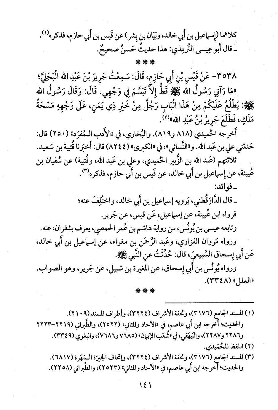 ثلاثتهم (عبد الله بن الزبير الحميدي، وعلي بن عبد الله، وقتيبة) عن سفيان بن عُيينة، عن إسماعيل بن أبي خالد، عن قيس بن أبي حازم، فذكره (¬٢).