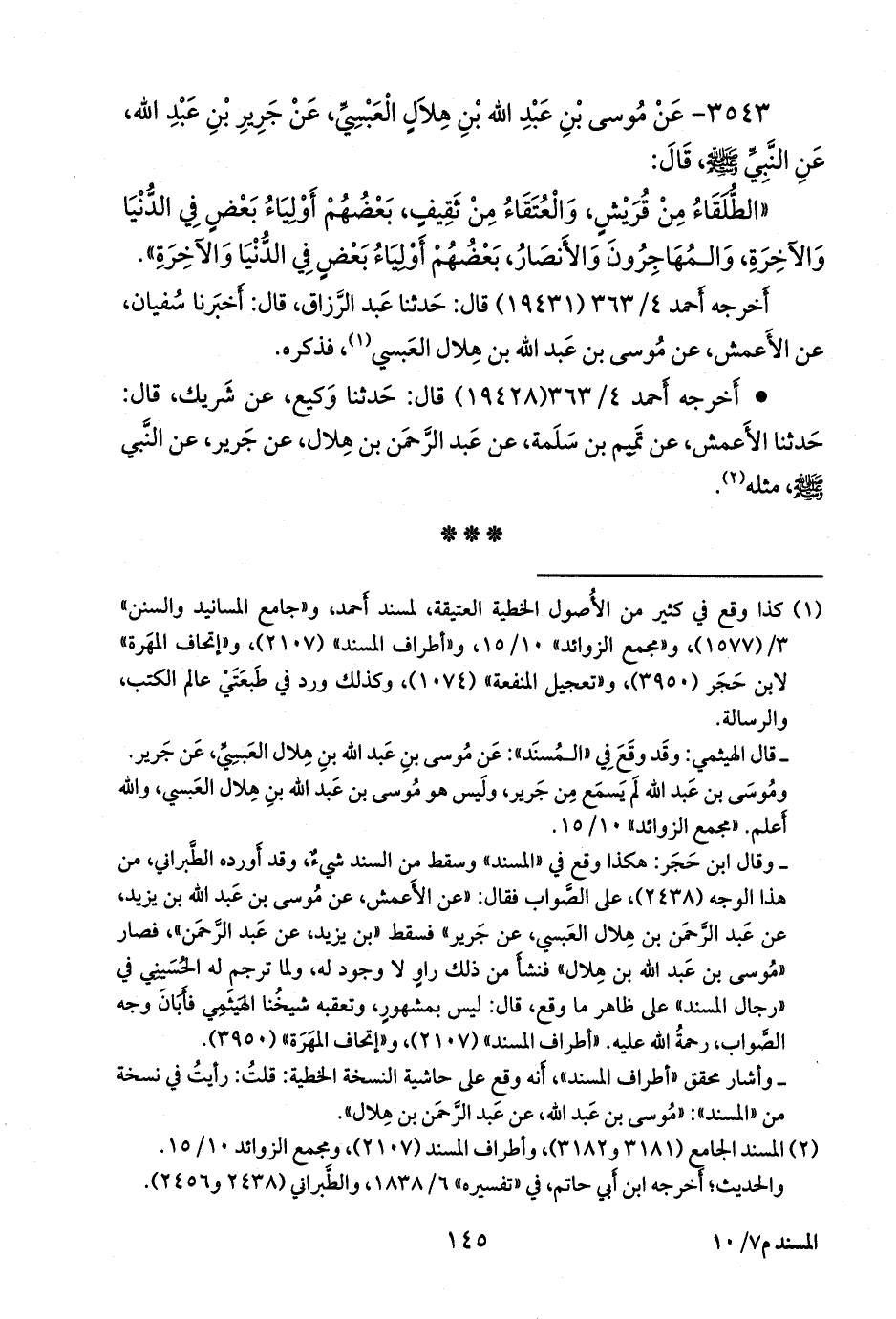 - وقال ابن حَجر: هكذا وقع في «المسند» وسقط من السند شيء، وقد أورده الطبراني، من هذا الوجه (٢٤٣٨)، على الصواب فقال: «عن الأعمش، عن موسى بن عبد الله بن يزيد، عن عبد الرَّحمَن بن هلال العبسي، عن جرير» فسقط «بن يزيد، عن عبد الرَّحمَن»، فصار «موسى بن عبد الله بن هلال» فنشأ من ذلك راو لاوجود له، ولما ترجم له الحسيني في «رجال المسند» على ظاهر ما وقع، قال: ليس بمشهور، وتعقبه شيخنا الهيثمي فأبان وجه الصواب، رحمة الله عليه. «أطراف المسند» (٢١٠٧)، و «إتحاف المهرة» (٣٩٥٠).