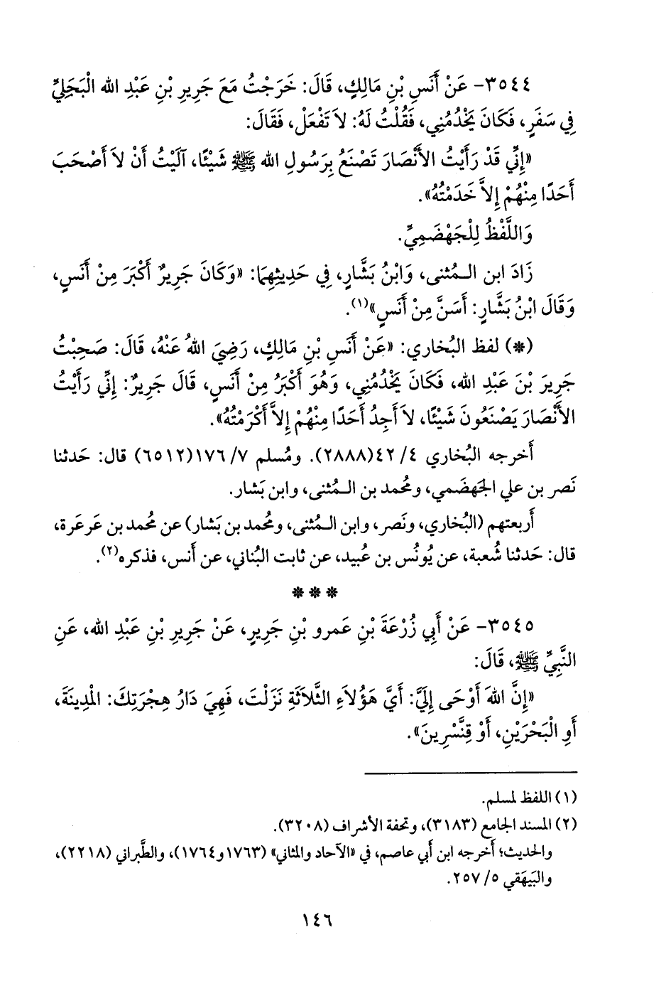 ٣٥٤٤ - عن أَنس بن مالك، قال: خرجت مع جَرير بن عبد الله البَجَلي في سفر، فكان يخدمني، فقلت له: لا تفعل، فقال: