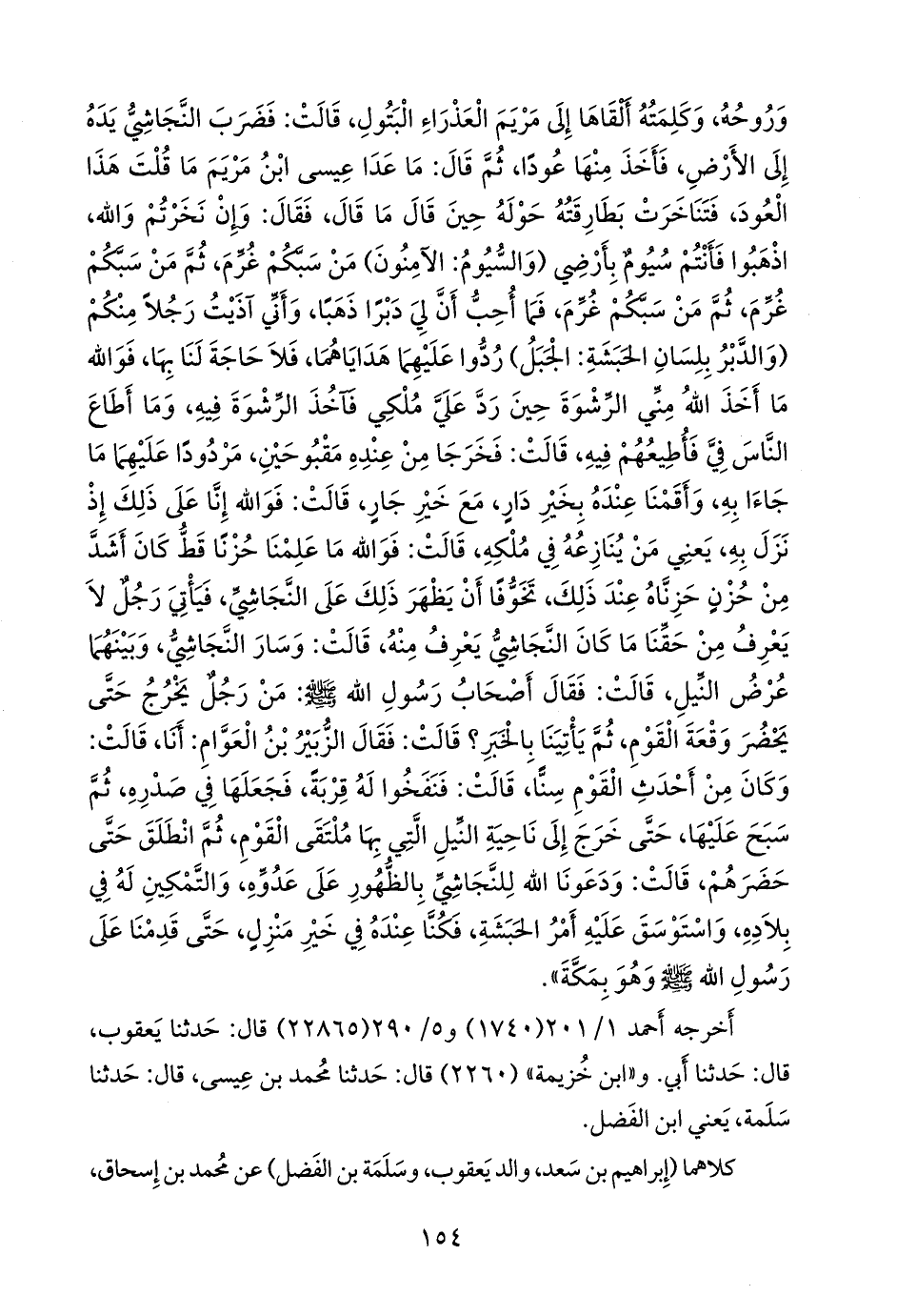 فما أحب أن لي دبرا ذهبا، وأني آذيت رجلا منكم (والدبر بلسان الحبشة: الجبل) ردوا عليهما هداياهما، فلا حاجة لنا بها، فوالله ما أخذ الله مني الرشوة حين رد علي ملكي فآخذ الرشوة فيه، وما أطاع الناس في فأطيعهم فيه، قالت: فخرجا من عنده مقبوحين، مردودا عليهما ما جاءا به، وأقمنا عنده بخير دار، مع خير جار، قالت: فوالله إنا على ذلك إذ نزل به، يعني من ينازعه في ملكه، قالت: فوالله ما علمنا حزنا قط كان أشد من حزن حزناه عند ذلك، تخوفا أن يظهر ذلك على النجاشي، فيأتي رجل لا يعرف من حقنا ما كان النجاشي يعرف منه، قالت: وسار النجاشي، وبينهما عرض النيل، قالت: فقال أصحاب رسول الله صَلى الله عَليه وسَلم: من رجل يخرج حتى يحضر وقعة القوم، ثم يأتينا بالخبر؟ قالت: فقال الزبير بن العوام: أنا، قالت: وكان من أحدث القوم سنا، قالت: فنفخوا له قربة، فجعلها في صدره، ثم سبح عليها، حتى خرج إلى ناحية النيل التي بها ملتقى القوم، ثم انطلق حتى حضرهم، قالت: ودعونا الله للنجاشي بالظهور على عدوه، والتمكين له في بلاده، واستوسق عليه أمر الحبشة، فكنا عنده في خير منزل، حتى قدمنا على رسول الله صَلى الله عَليه وسَلم وهو بمكة».