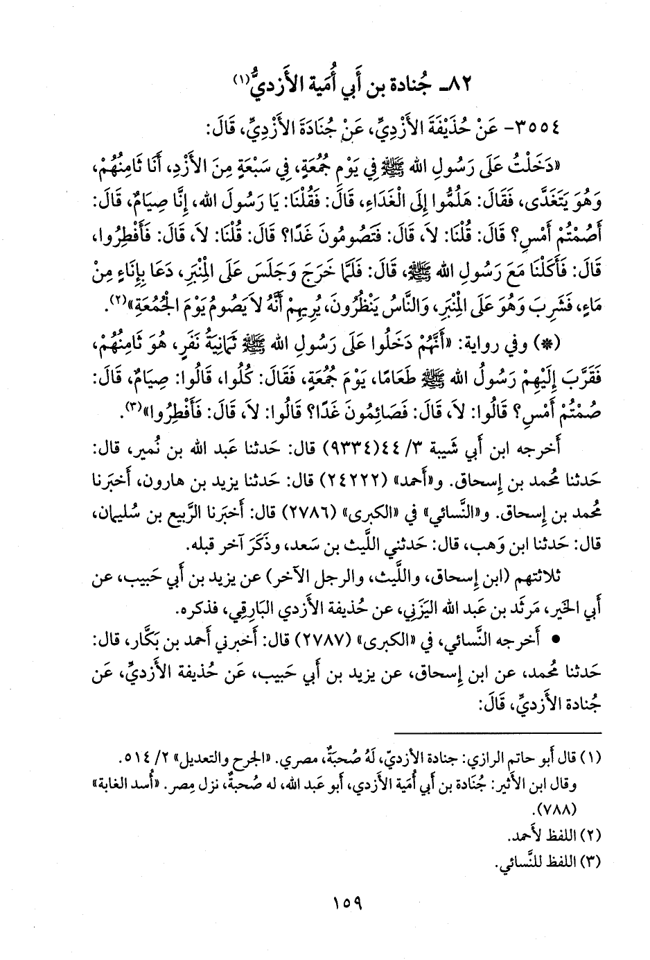 - أَخرجه النَّسَائي في «الكبرى» (٢٧٨٧) قال: أخبرني أحمد بن بكار، قال: حدثنا محمد، عن ابن إسحاق، عن يزيد بن أبي حبيب، عن حذيفة الأزدي، عن جنادة الأزدي، قال: