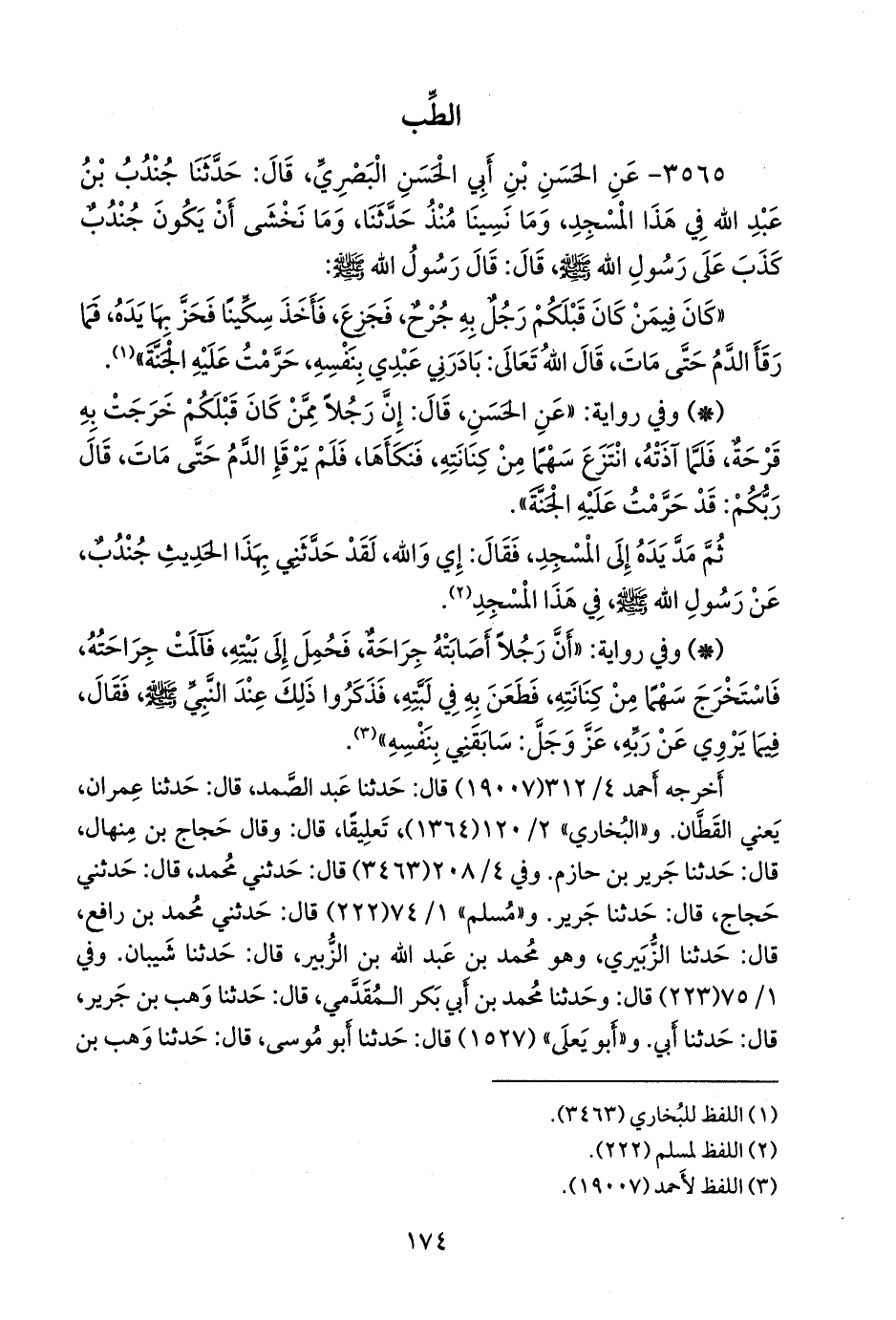 - وفي رواية: «عن الحسن، قال: إن رجلا ممن كان قبلكم خرجت به قرحة، فلما آذته، انتزع سهما من كنانته، فنكأها، فلم يرقإ الدم حتى مات، قال ربكم: قد حرمت عليه الجنة».