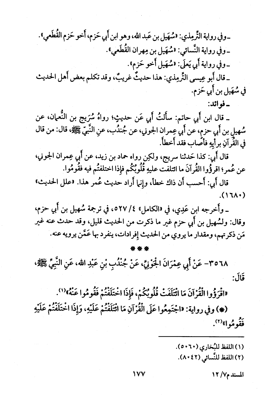قال أبي: كذا حدثنا سريج، ولكن رواه حماد بن زيد، عن أبي عمران الجَوني، عن عمر؛ اقرؤوا القرآن ما ائتلفت عليه قلوبكم فإذا اختلفتم فيه فقوموا.