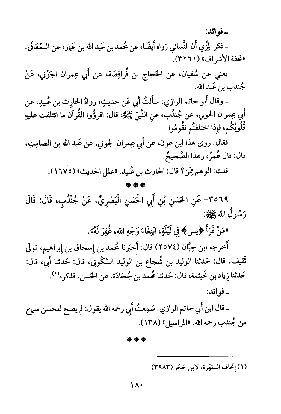- وقال أَبو حاتم الرازي: سألت أبي عن حديث؛ رواه الحارث بن عبيد، عن أبي عمران الجَوني، عن جندب، عن النبي صَلى الله عَليه وسَلم قال: اقرؤوا القرآن ما ائتلفت عليه قلوبكم، فإذا اختلفتم فقوموا، فقال: روى هذا ابن عون، عن أبي عمران الجَوني، عن عبد الله بن الصامت، قال: قال عمر، وهذا الصحيح.