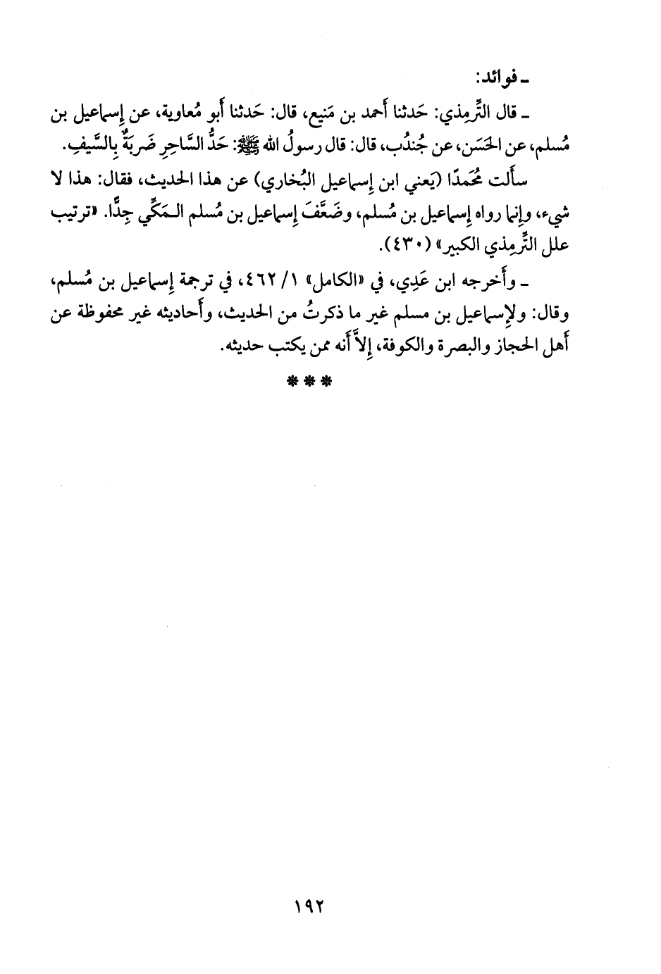 - وقال التِّرمِذي: حدثنا أَحمد بن مَنيع، قال: حدثنا أَبو معاوية، عن إِسماعيل بن مُسلم، عن الحسن، عن جُندب، قال: قال رسول الله صَلى الله عَليه وسَلم: حَدُّ السَّاحِرِ ضَربَةٌ بِالسَّيْفِ.
