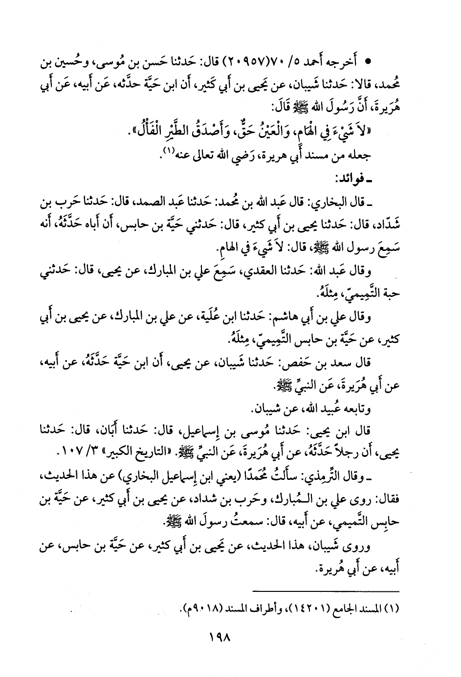 - قال البخاري: قال عبد الله بن محمد: حدثنا عبد الصمد، قال: حدثنا حرب بن شداد، قال: حدثنا يحيى بن أبي كثير، قال: حدثني حية بن حابس، أن أباه حدثه، أنه سمع رسول الله صَلى الله عَليه وسَلم قال: لا شيء في الهام.