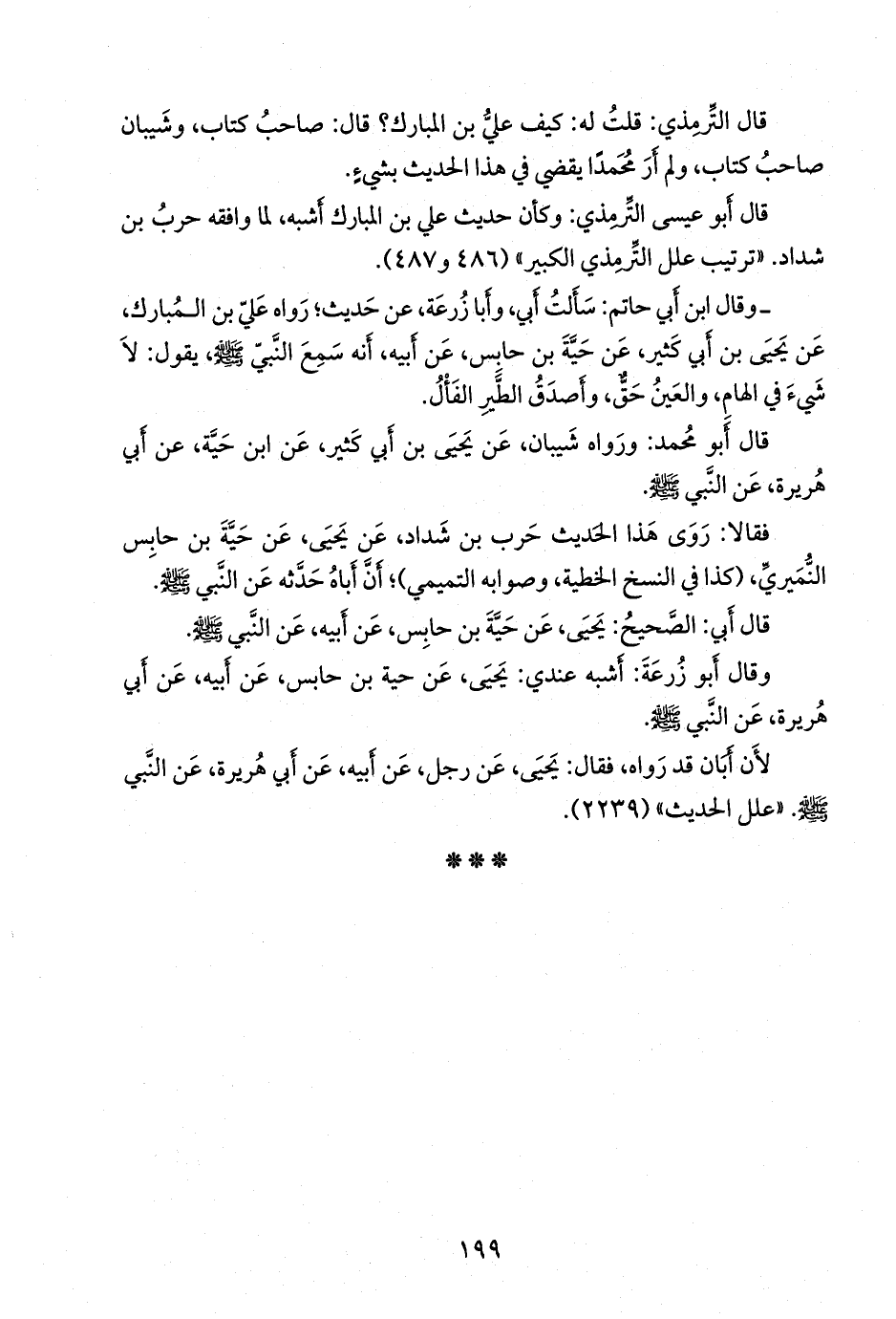 - وقال ابن أبي حاتم: سألت أبي، وأَبا زُرعَة، عن حديث؛ رواه علي بن المبارك، عن يحيى بن أبي كثير، عن حية بن حابس، عن أبيه، أنه سمع النبي صَلى الله عَليه وسَلم يقول: لا شيء في الهام، والعين حق، وأصدق الطير الفأل.
