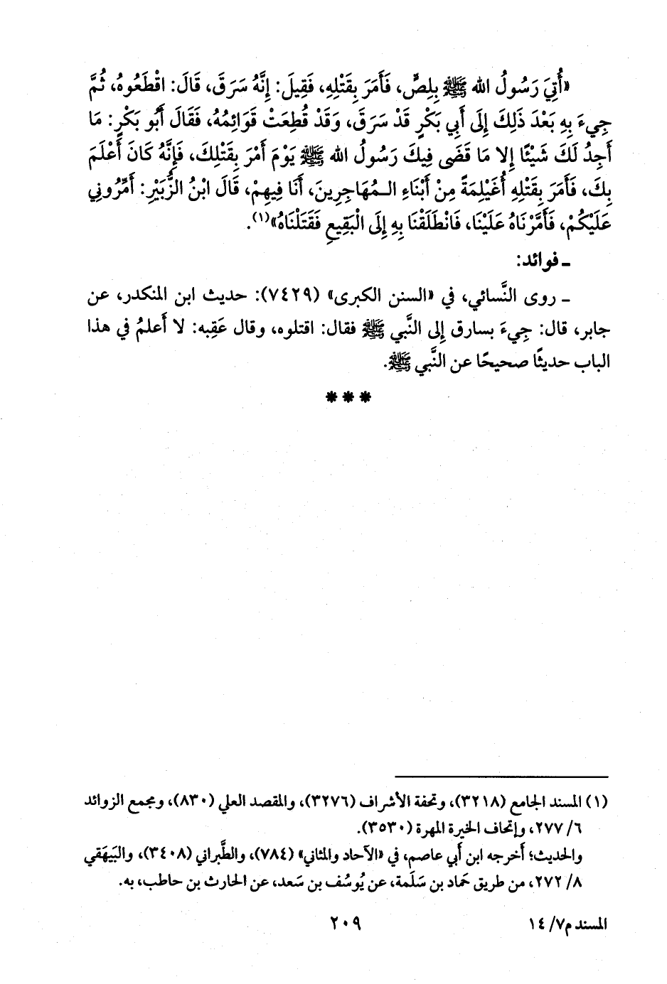 - روى النَّسَائي في «السنن الكبرى» (٧٤٢٩): حديث ابن المُنكدِر، عن جابر، قال: جيء بسارق إلى النبي صَلى الله عَليه وسَلم فقال: اقتلوه، وقال عقبه: لا أعلم في هذا الباب حديثا صحيحا عن النبي صَلى الله عَليه وسَلم.