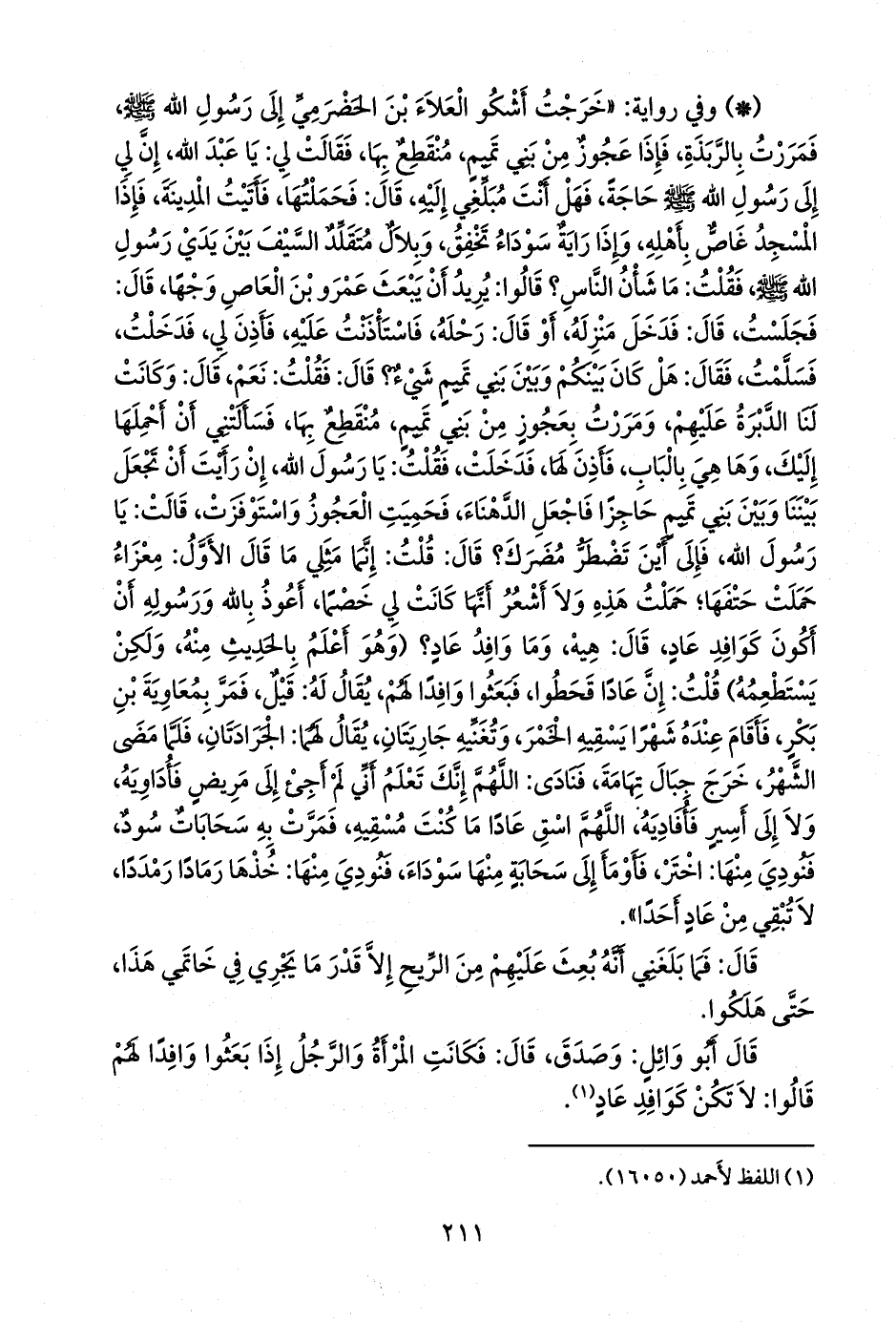 - وفي رواية: «خرجت أشكو العلاء بن الحضرمي إلى رسول الله صَلى الله عَليه وسَلم فمررت بالربذة، فإذا عجوز من بني تميم، منقطع بها، فقالت لي: يا عبد الله، إن لي إلى رسول الله صَلى الله عَليه وسَلم حاجة، فهل أنت مبلغي إليه، قال: فحملتها، فأتيت المدينة، فإذا المسجد غاص بأهله، وإذا راية سوداء تخفق، وبلال متقلد السيف بين يدي رسول الله صَلى الله عَليه وسَلم فقلت: ما شأن الناس؟ قالوا: يريد أن يبعث عَمرو بن العاص وجها، قال: فجلست، قال: فدخل منزله، أو قال: رحله، فاستأذنت عليه، فأذن لي، فدخلت، فسلمت، فقال: هل كان بينكم وبين بني تميم شيء؟ قال: فقلت: نعم، قال: وكانت لنا الدبرة عليهم، ومررت بعجوز من بني تميم، منقطع بها، فسألتني أن أحملها إليك، وها هي بالباب، فأذن لها، فدخلت، فقلت: يا رسول الله، إن رأيت أن تجعل بيننا وبين بني تميم حاجزا فاجعل الدهناء، فحميت العجوز واستوفزت، قالت: يا رسول الله، فإلى أين تضطر مضرك؟ قال: قلت: إنما مثلي ما قال الأول: معزاء حملت حتفها؛ حملت هذه ولا أشعر أنها كانت لي خصما، أعوذ بالله ورسوله أن أكون كوافد عاد، قال: هيه، وما وافد عاد؟ (وهو أعلم بالحديث منه، ولكن يستطعمه) قلت: إن عادا قحطوا، فبعثوا وافدا لهم، يقال له: قيل، فمر بمعاوية بن بكر، فأقام عنده شهرا يسقيه الخمر، وتغنيه جاريتان، يقال لهما: الجرادتان، فلما مضى الشهر، خرج جبال تهامة، فنادى: اللهم إنك تعلم أني لم أجئ إلى مريض فأداويه، ولا إلى أسير فأفاديه، اللهم اسق عادا ما كنت مسقيه، فمرت به سحابات سود، فنودي منها: اختر، فأومأ إلى سحابة منها سوداء، فنودي منها: خذها رمادا رمددا، لا تبقي من عاد أحدا».