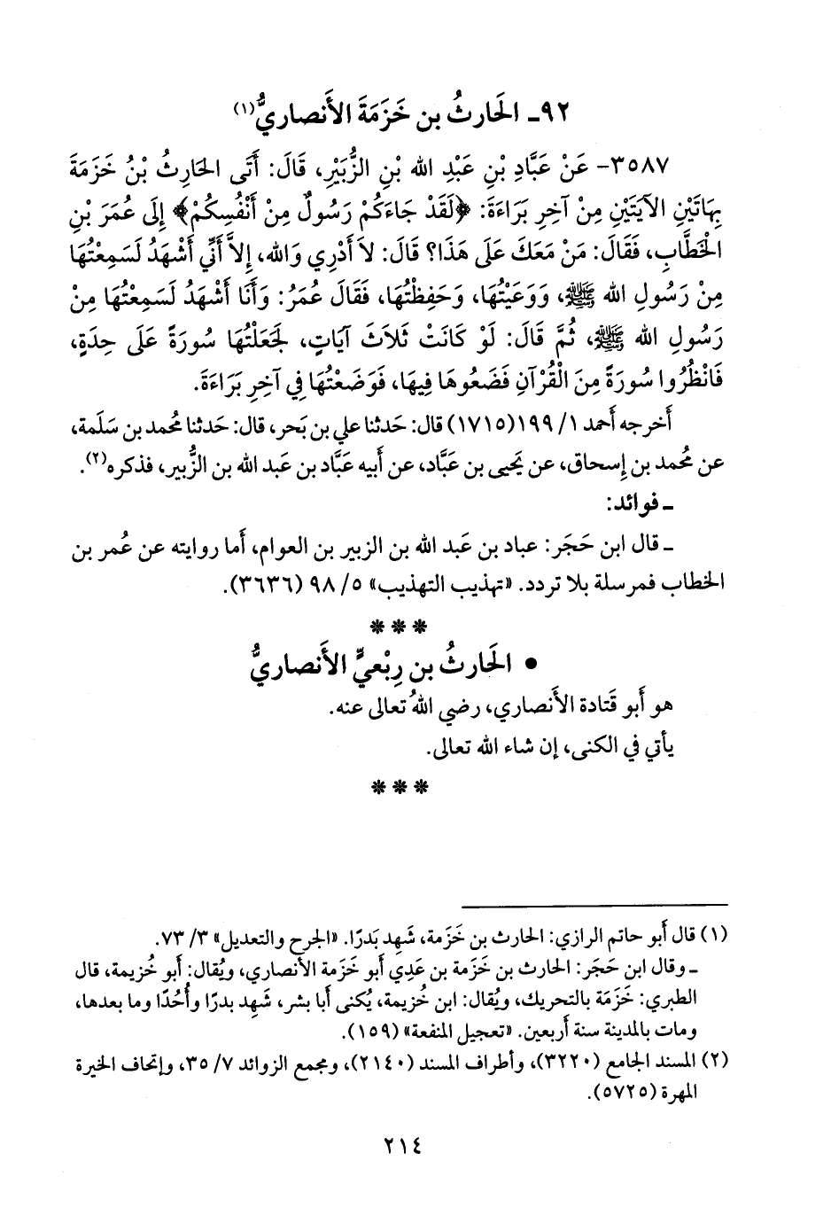 ٣٥٨٧ - عن عباد بن عبد الله بن الزبير، قال: أتى الحارث بن خزمة بهاتين الآيتين من آخر براءة: {لقد جاءكم رسول من أنفسكم} إلى عمر بن الخطاب، فقال: من معك على هذا؟ قال: لا أدري والله، إلا أني أشهد لسمعتها من رسول الله صَلى الله عَليه وسَلم ووعيتها، وحفظتها، فقال عمر: وأنا أشهد لسمعتها من رسول الله صَلى الله عَليه وسَلم ثم قال: لو كانت ثلاث آيات، لجعلتها سورة على حدة، فانظروا سورة من القرآن فضعوها فيها، فوضعتها في آخر براءة.